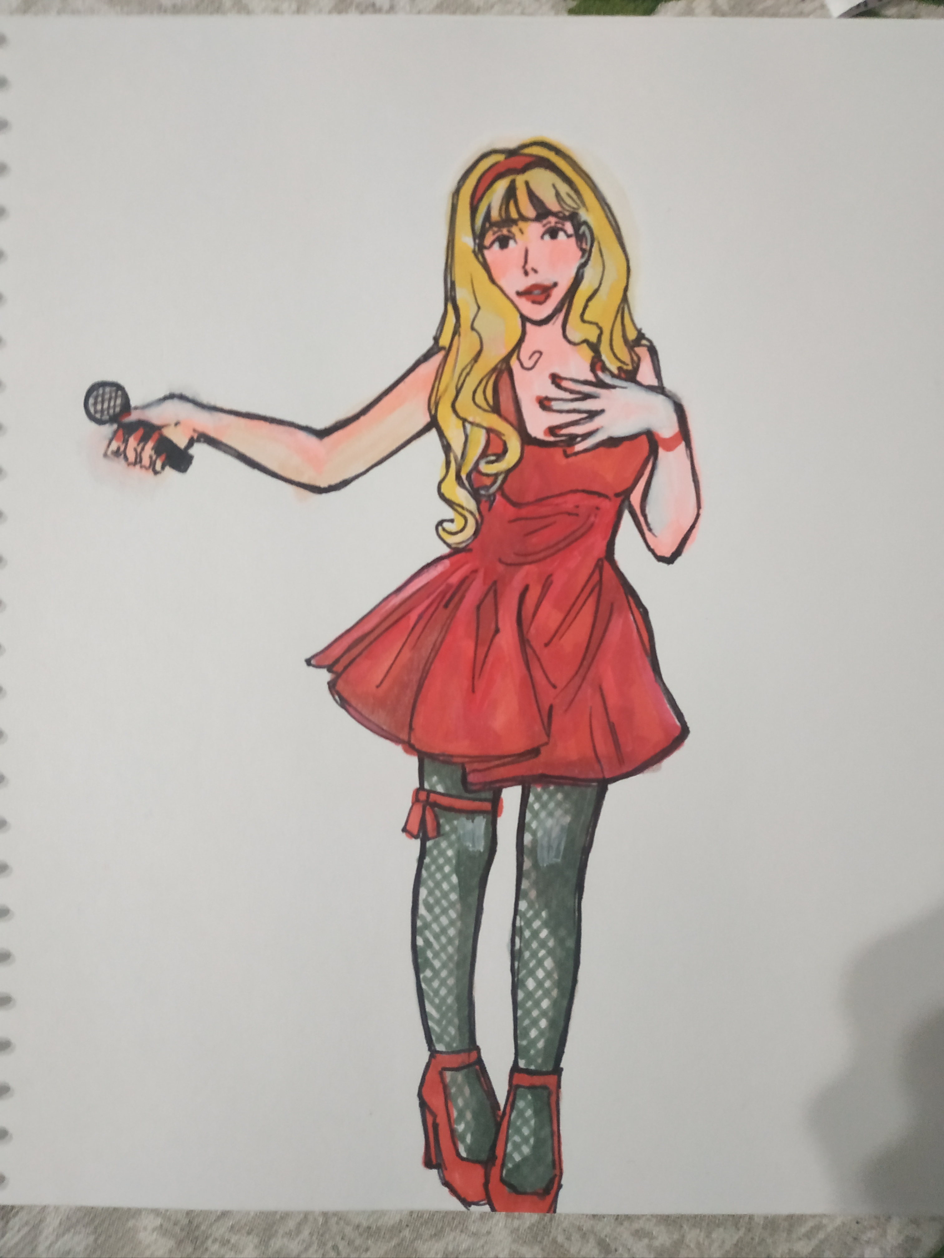 Мой рисунок: певица в красном платье маркерами