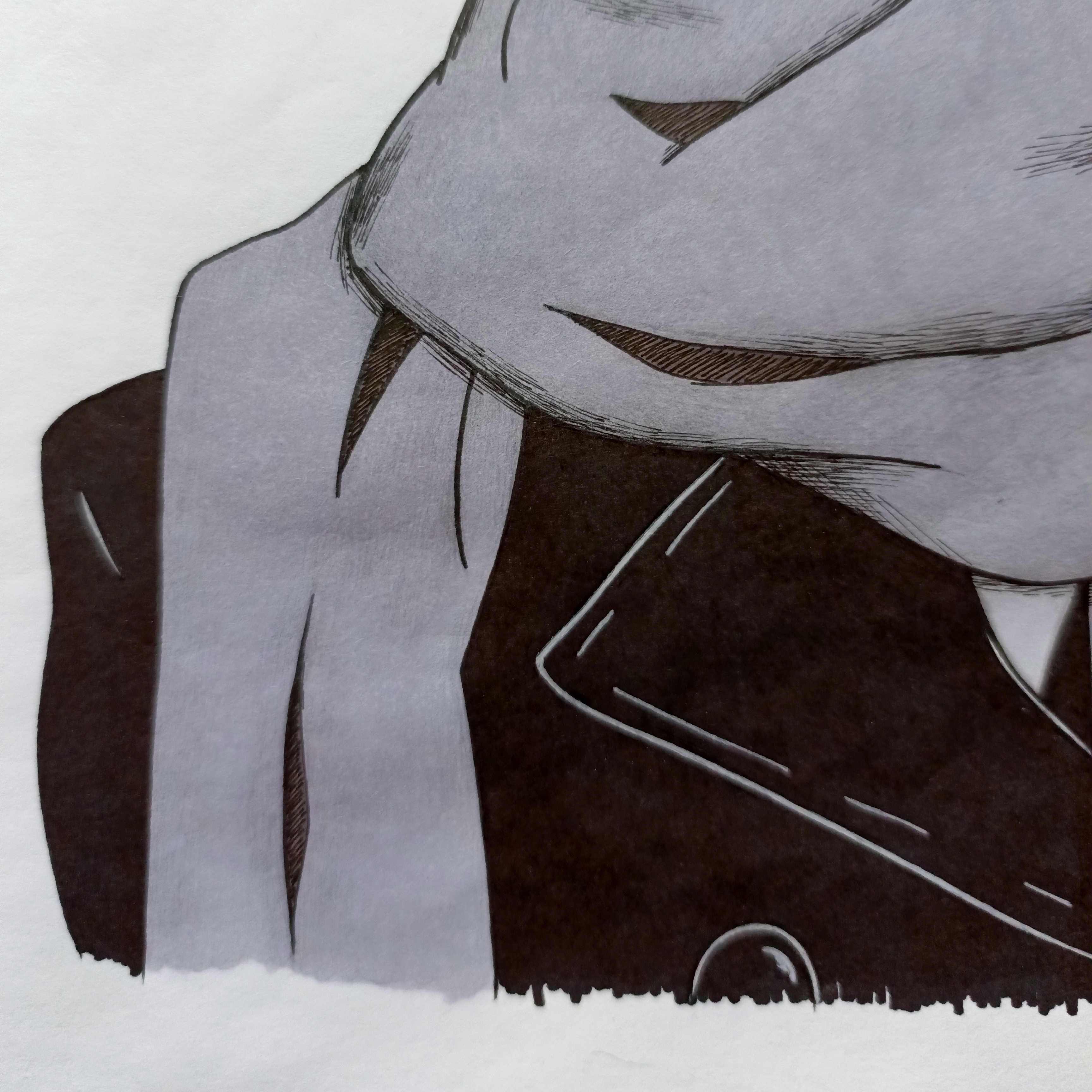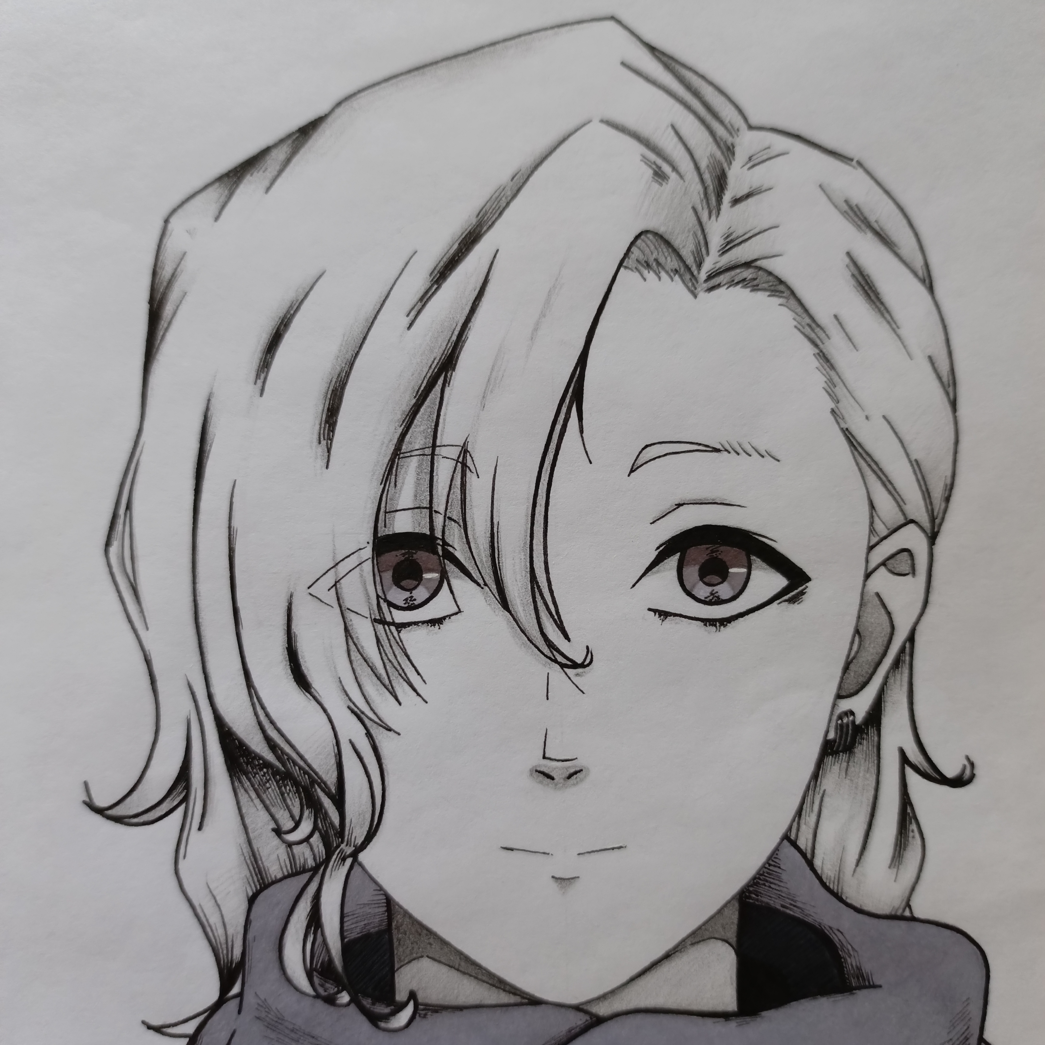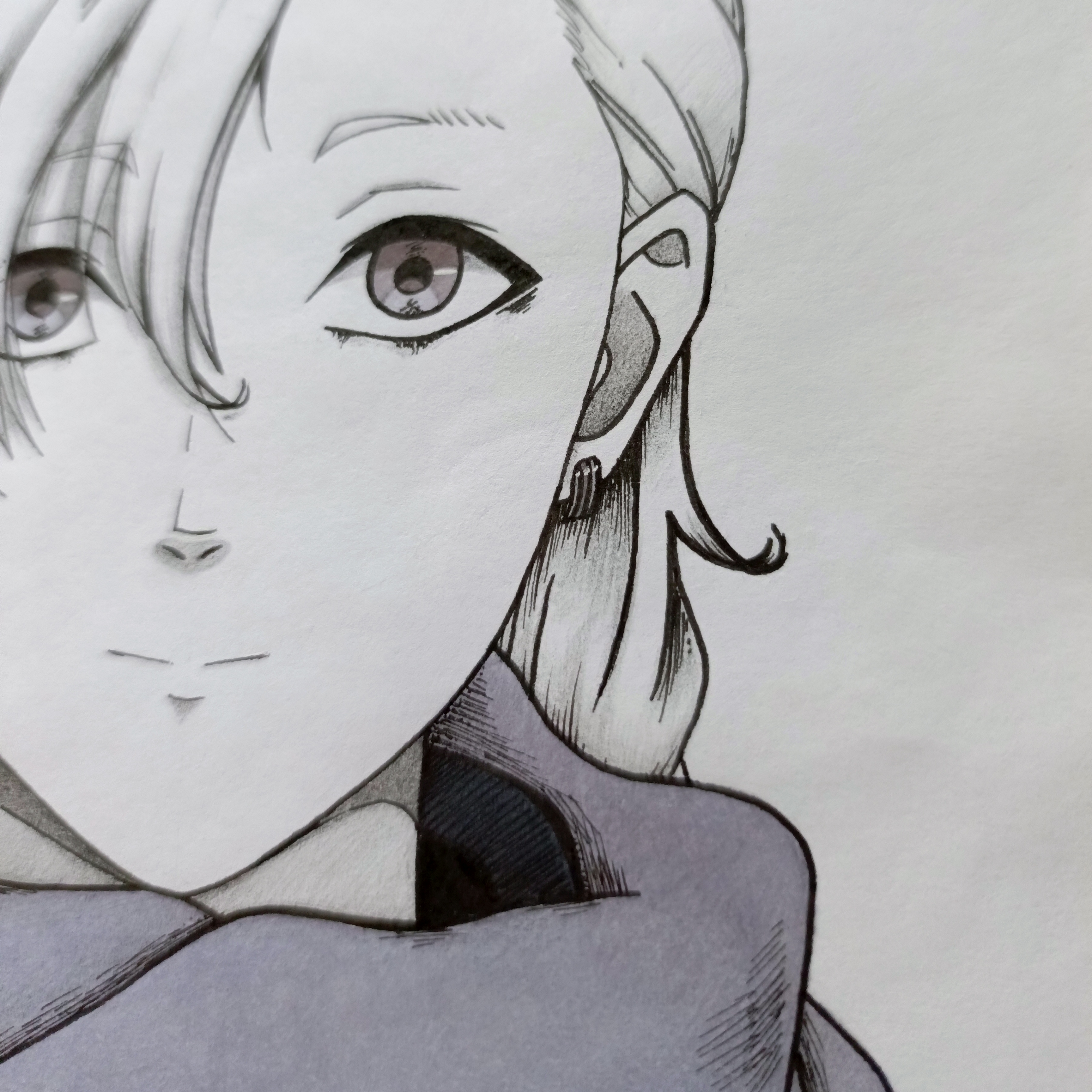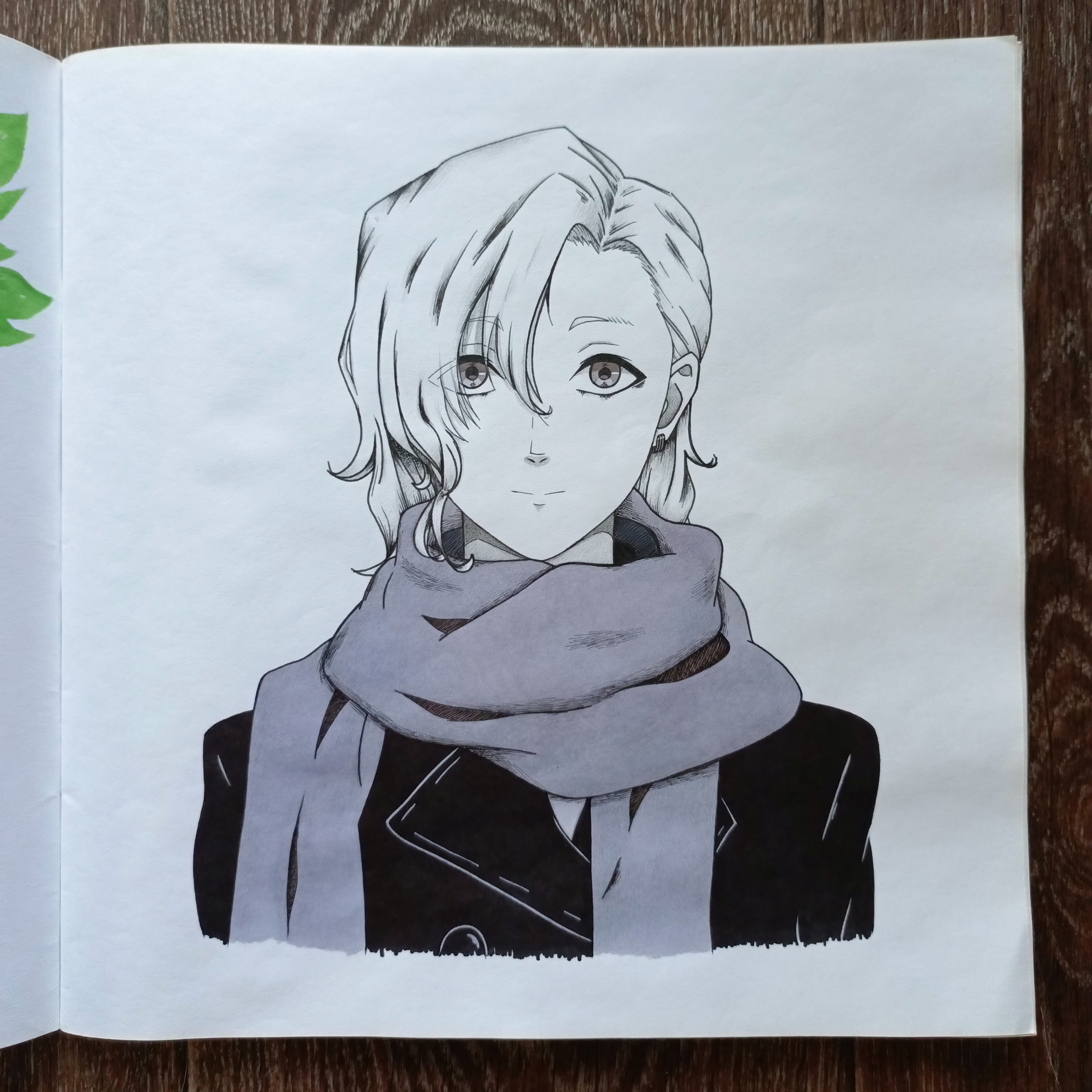 В пору активного увлечения аниме нарисовала оригинального персонажа, пол которого так и не смогла определить. Судя по стороне, на которую запахнуто пальто, это девушка, но стопроцентной уверенности нет. Вероятно, в процессе рисования я действовала по наитию. Больше всего нравилось накладывать штриховку линером, как карандашом.
