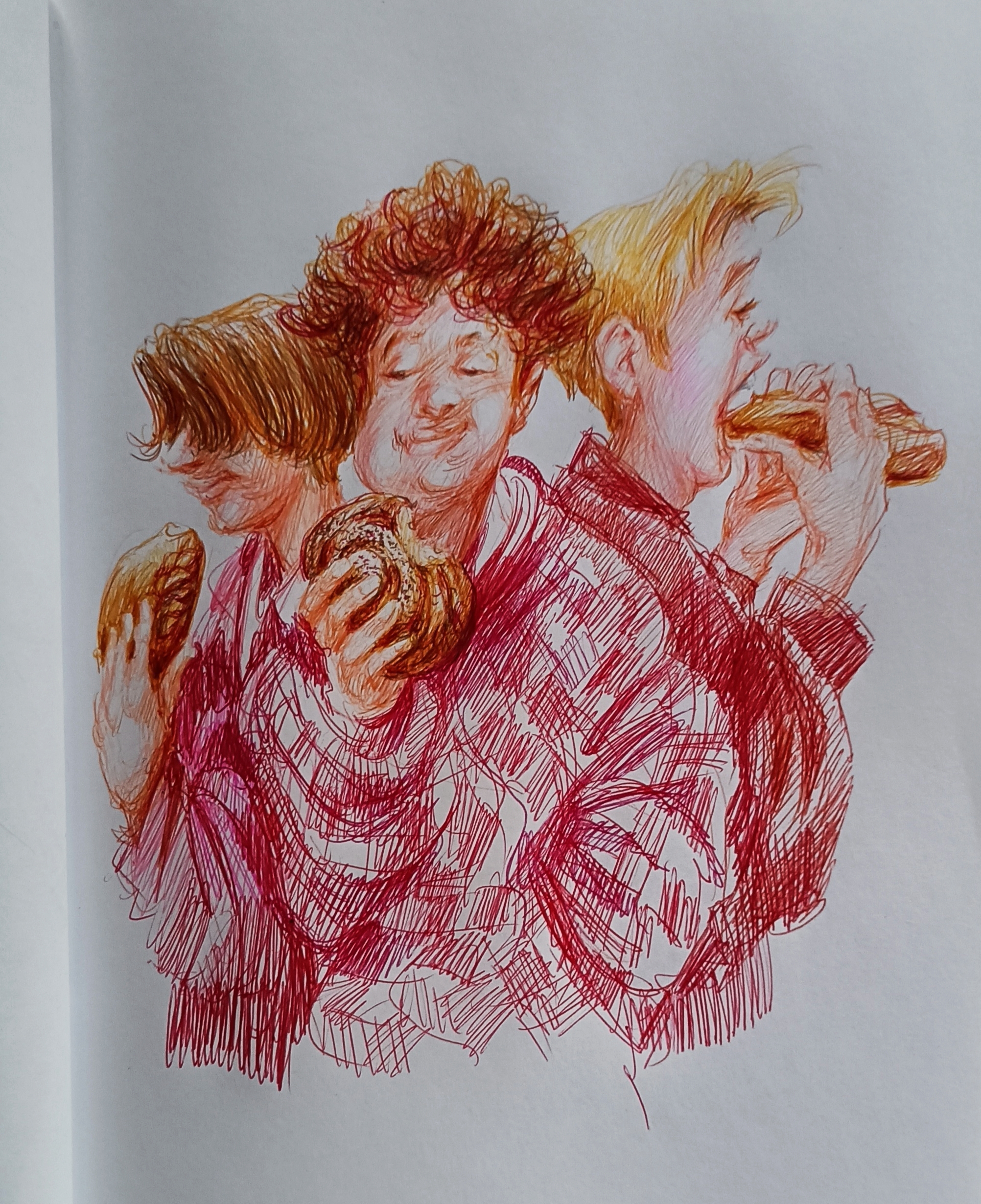 Шла на днях мимо пекарни, там клубились подростки, поедали выпечку. По цветовой гамме они они были схожи с плюшками, которые покупали: сдобные цвета волос и кожи. Я подумала, что если бы ещё и одежда у них была цвета булочек и пирожков с вареньем, то они могли бы целиком гармонировать со сдобой. В общем, подсмотрено и дополнено мною.