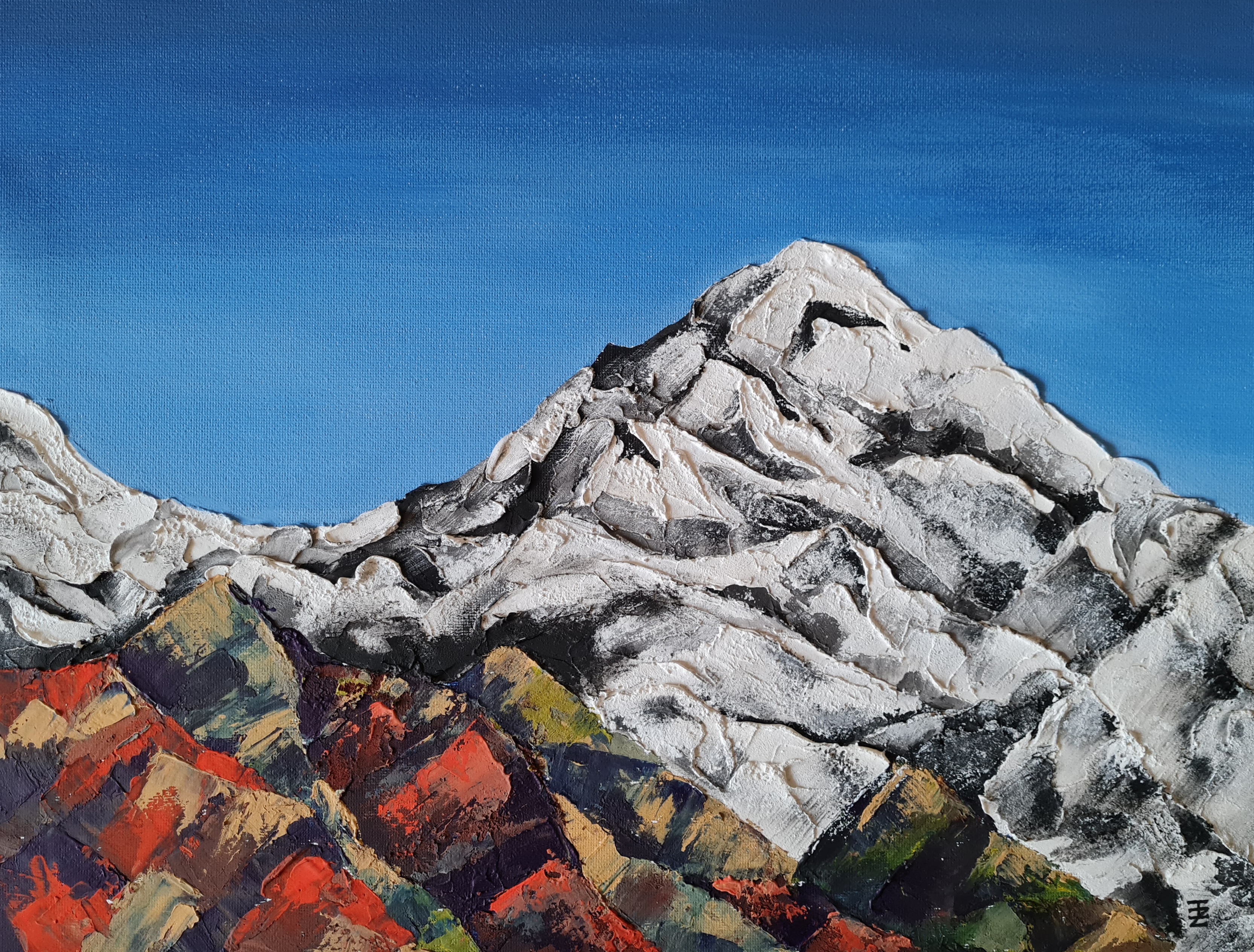 На работах изображены горы, которые мне удалось увидеть вживую — г. Белалакая на Домбае, г. Тип-Тяв в Самаре (родные края) и г. Казбек. Все картины выполнены акрилом и темперой, а для большей «фактурности» и создания объемных мазков использовалась текстурная паста.