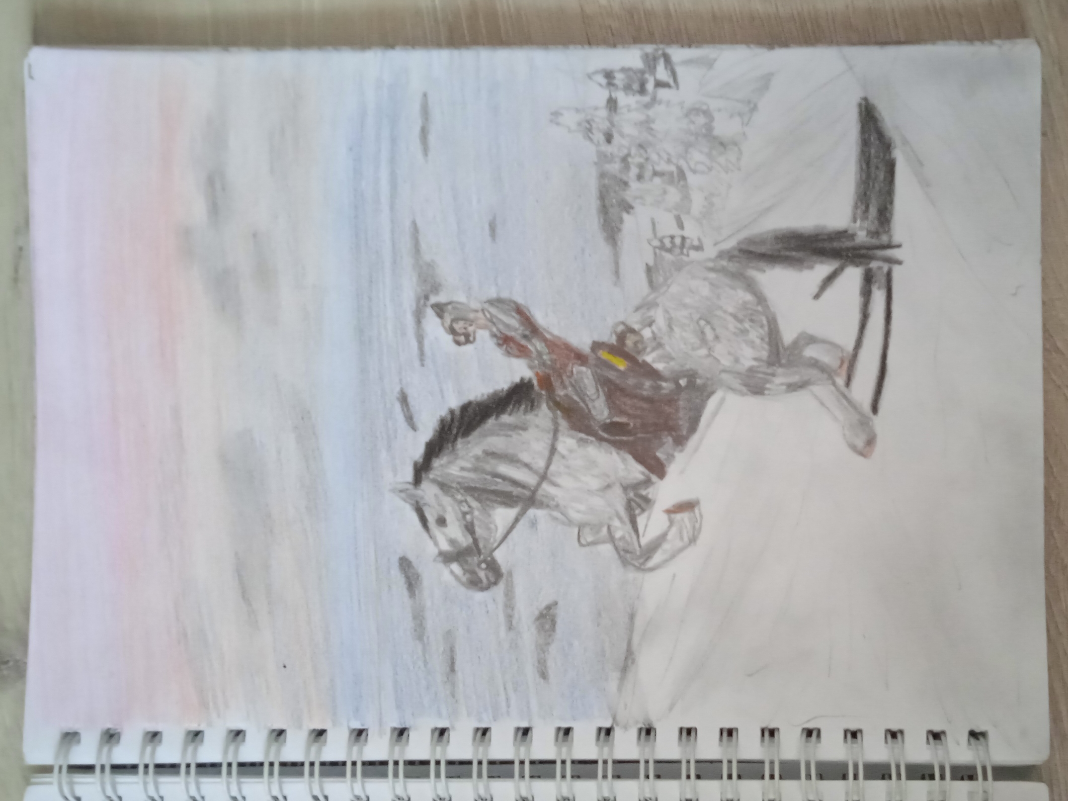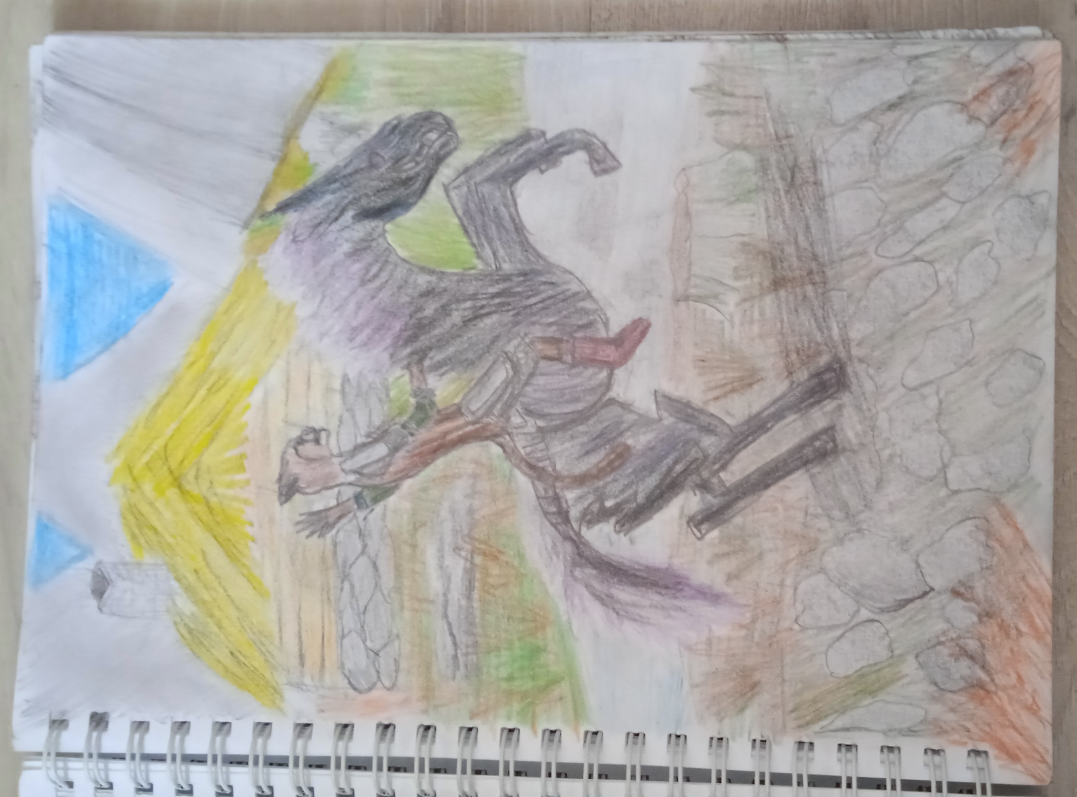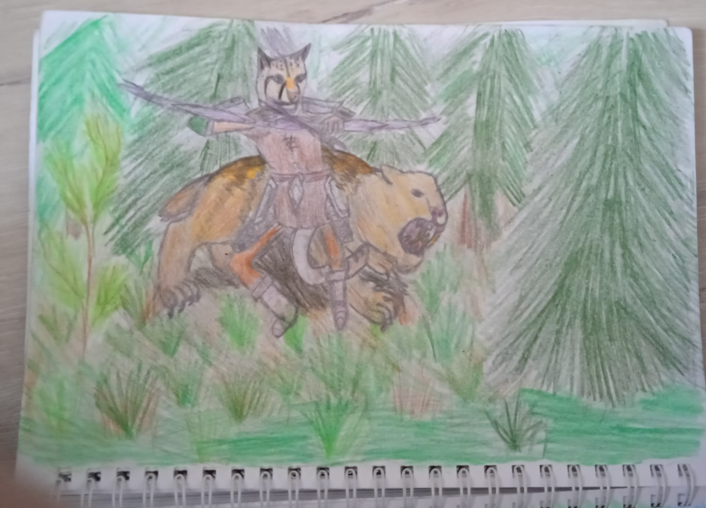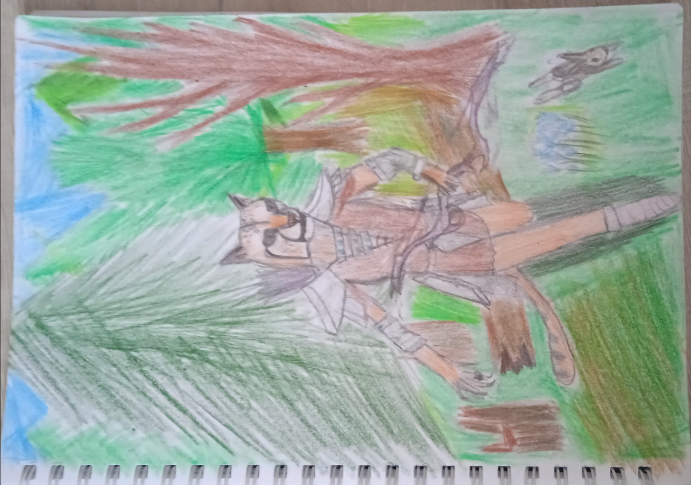 У меня срисовывать очень хорошо получается и разукрашивать цветными карандашами тоже хорошо выходит, поэтому я находила всякие классные картинки или делала скриншоты с компьютера и потом скомпликтовав срисовала. Вышло очень хорошо. Правда, когда фотографировала некоторая яркость исчезла