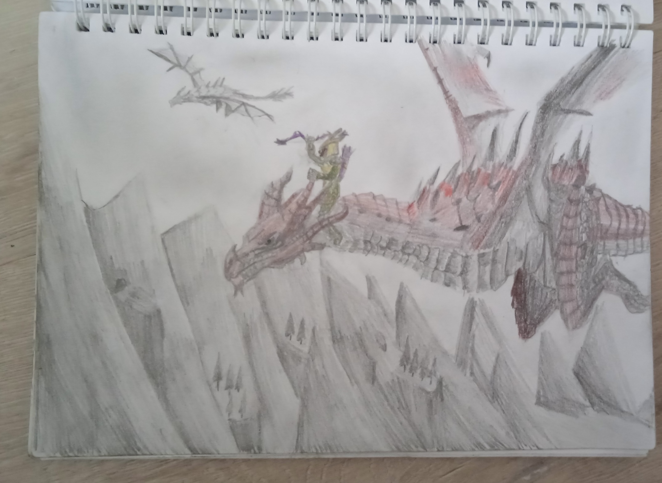 Решила рисовать свою персонажку, потому что люблю ПК игру скайрим, тем более мне подарили ну, что-то по типу тетрадки с логотипом скайрима, и я решила рисовать именно там.