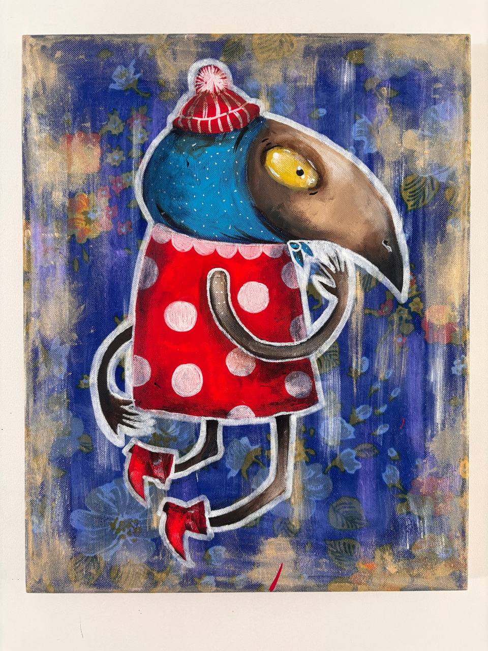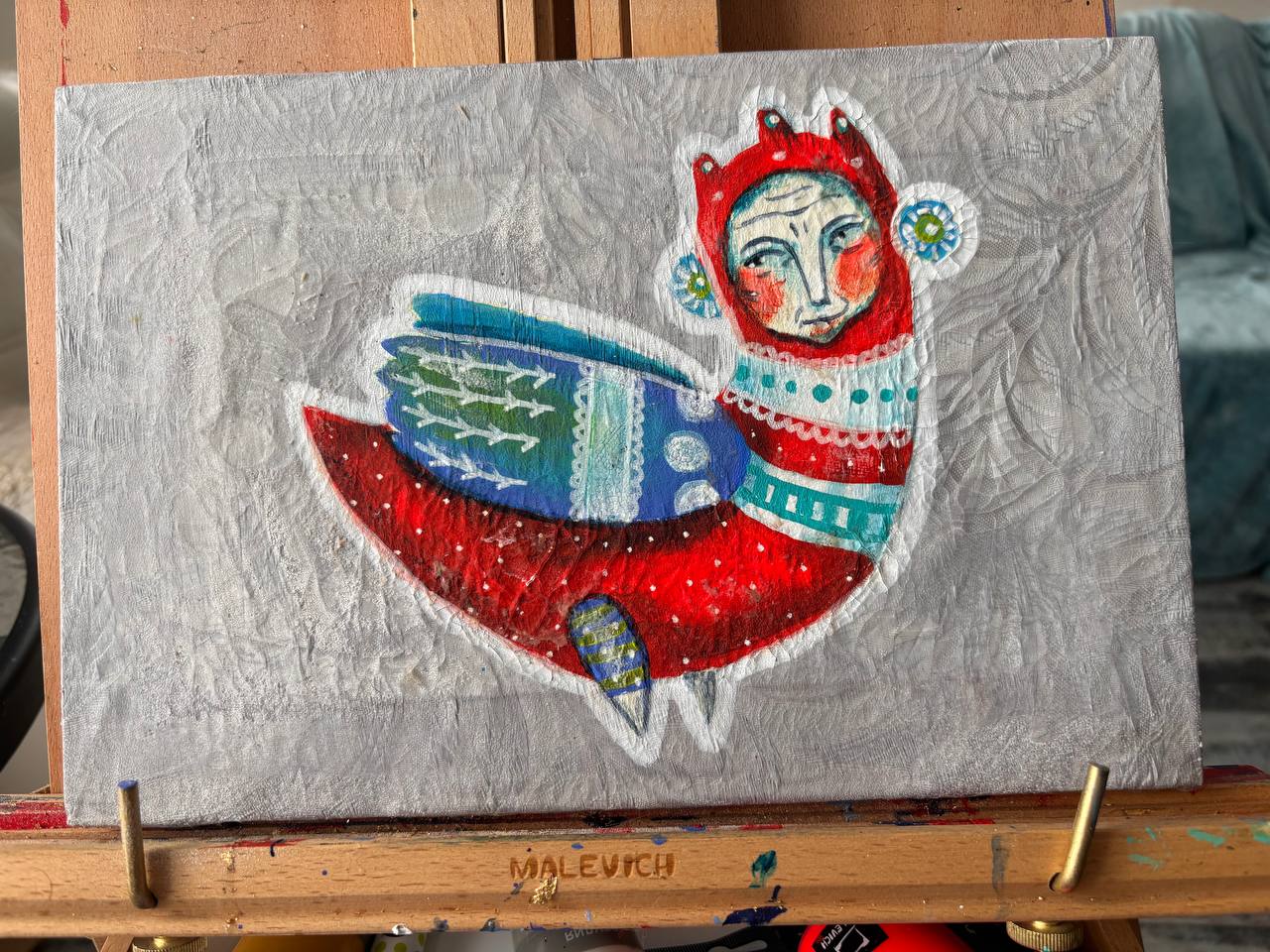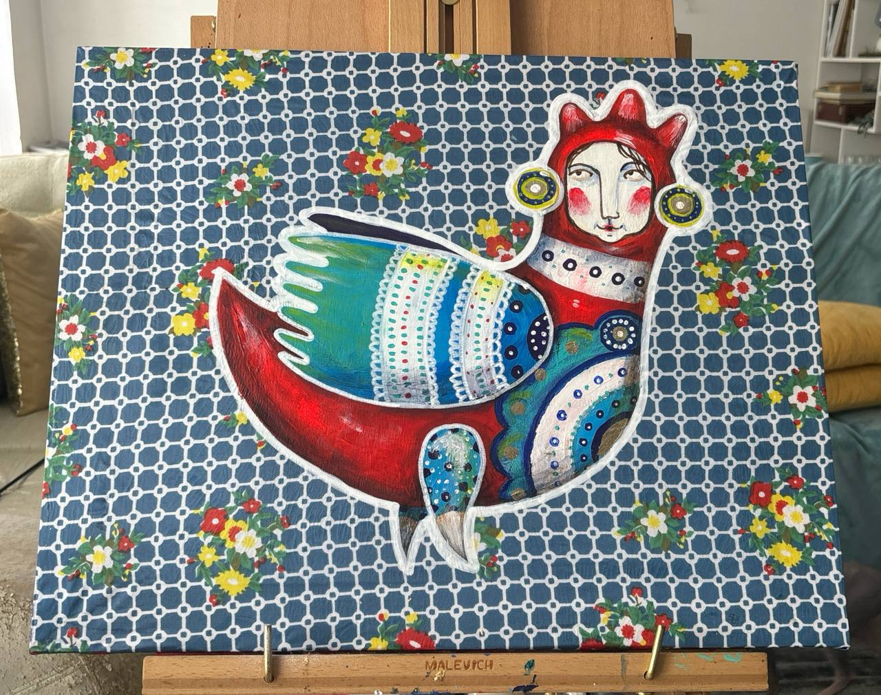 Кикимора и две курицы, тряпка на подрамнике, акрил.