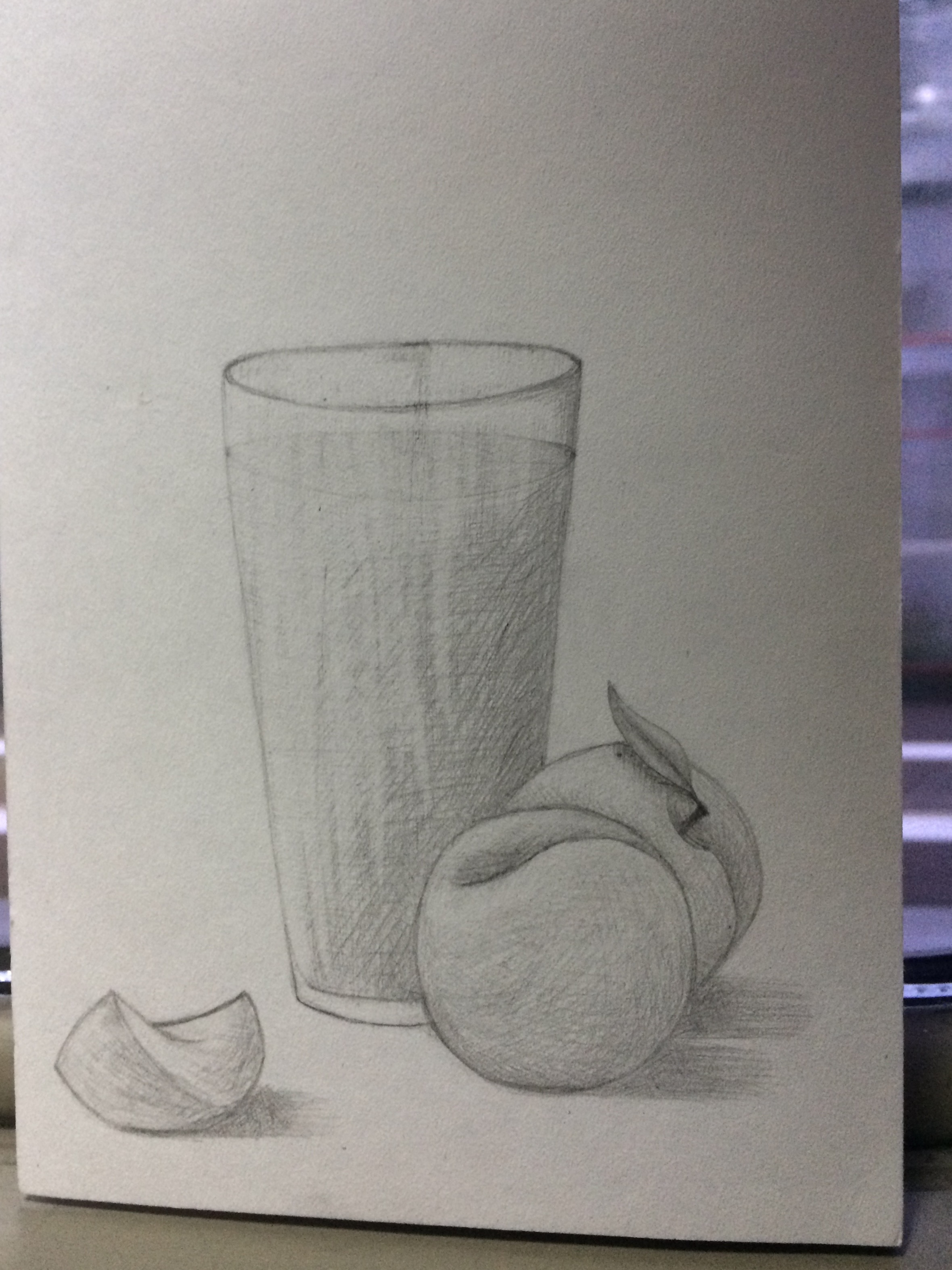 Видимо, никто не хотел играть со мной в карты, так что я решила немного порисовать. В качестве натуры выбрала композицию на упаковке с соком. Стакан получился откровенно кривым, а вот персики мне даже нравятся.