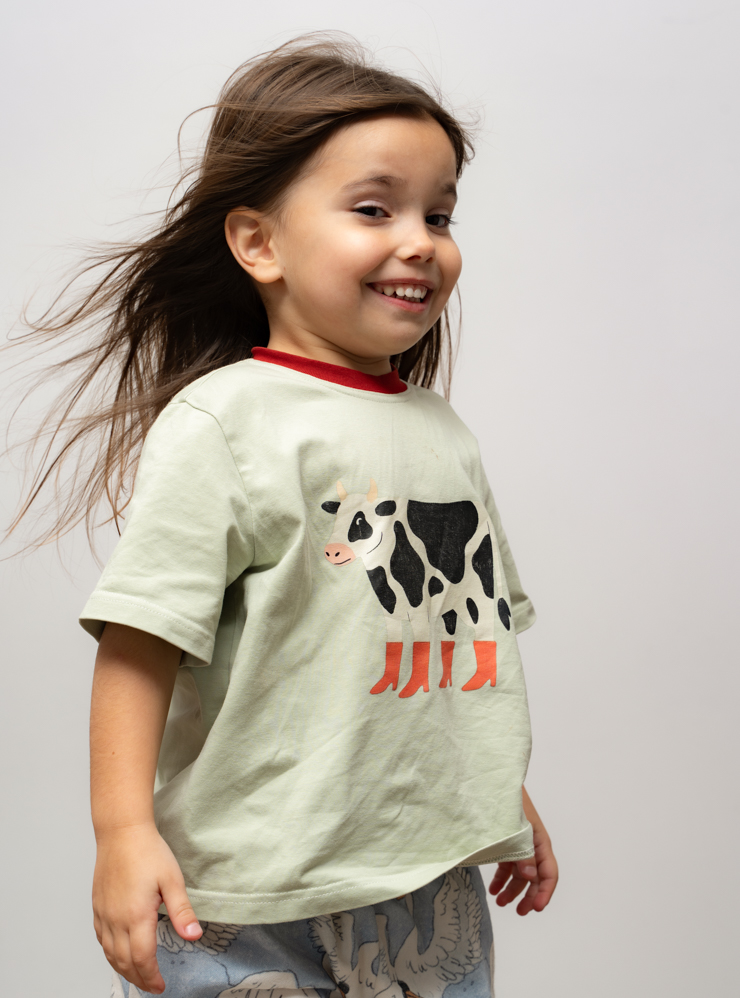 Потом была летняя коллекция. Там ягоды, овощи, штаны с помидорами и милый сердцу каждого миллениала бутерброд с вареньем. Хорошо зашла футболка с коровой в сапогах. Женя часто встречала на «Пинтересте» лошадей и куриц в сапогах, и ей захотелось сделать свою версию животного в сапогах — корову. Шалость удалась.