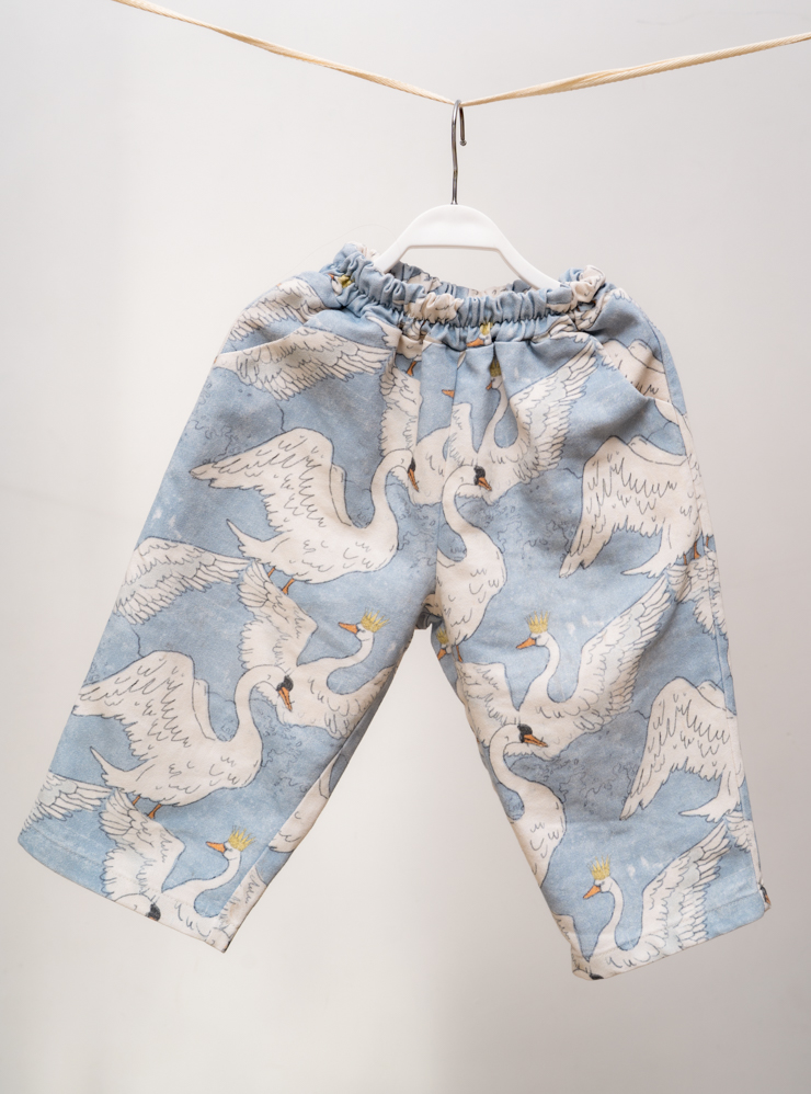Решили, что не хотим делать просто партии футболок, а будем разрабатывать тематические коллекции — дропы. Первая была по мотивам русских сказок. Мы сшили штаны с петухами, брюки с Царевной Лебедью, футболку с теремком, с петушком на палочке. Русская коллекция разлетелась быстро, пришлось дошивать дополнительные изделия. Мы продали 100 голубых брюк с лебедями, хотя я в них не верил.