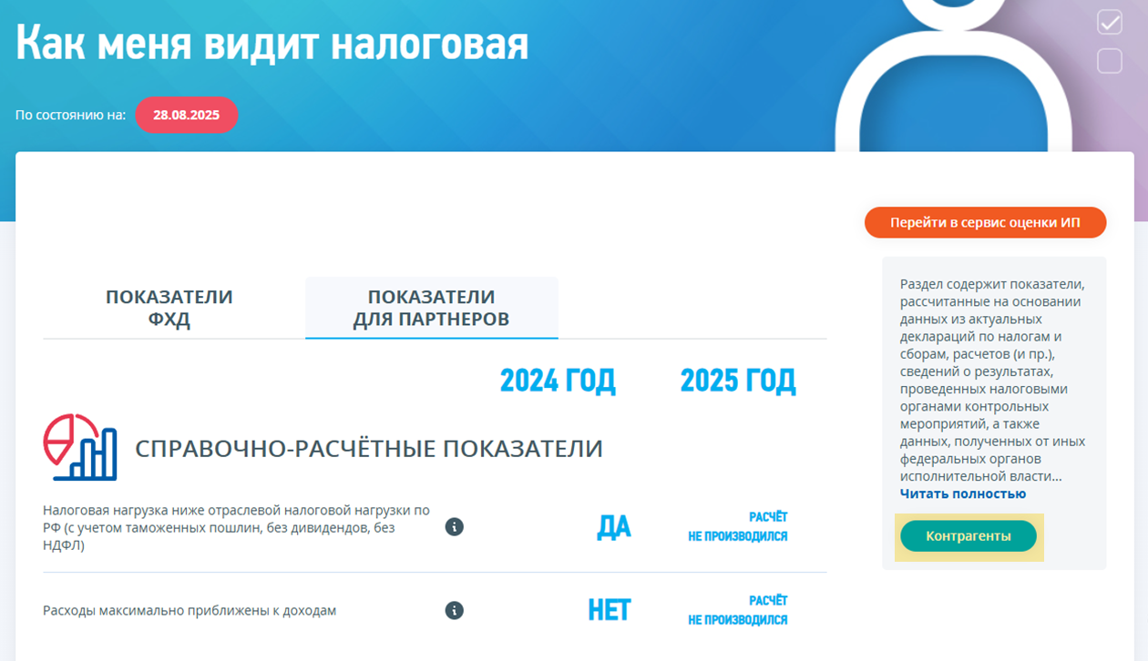 В сервисе «Как меня видит налоговая» в личном кабинете компании или ИП на сайте ФНС собраны ключевые показатели бизнеса. По этим данным инспекция судит о добросовестности бизнеса, а ИП и организации могут узнать, как выглядят в глазах налоговой они сами и их контрагенты.
