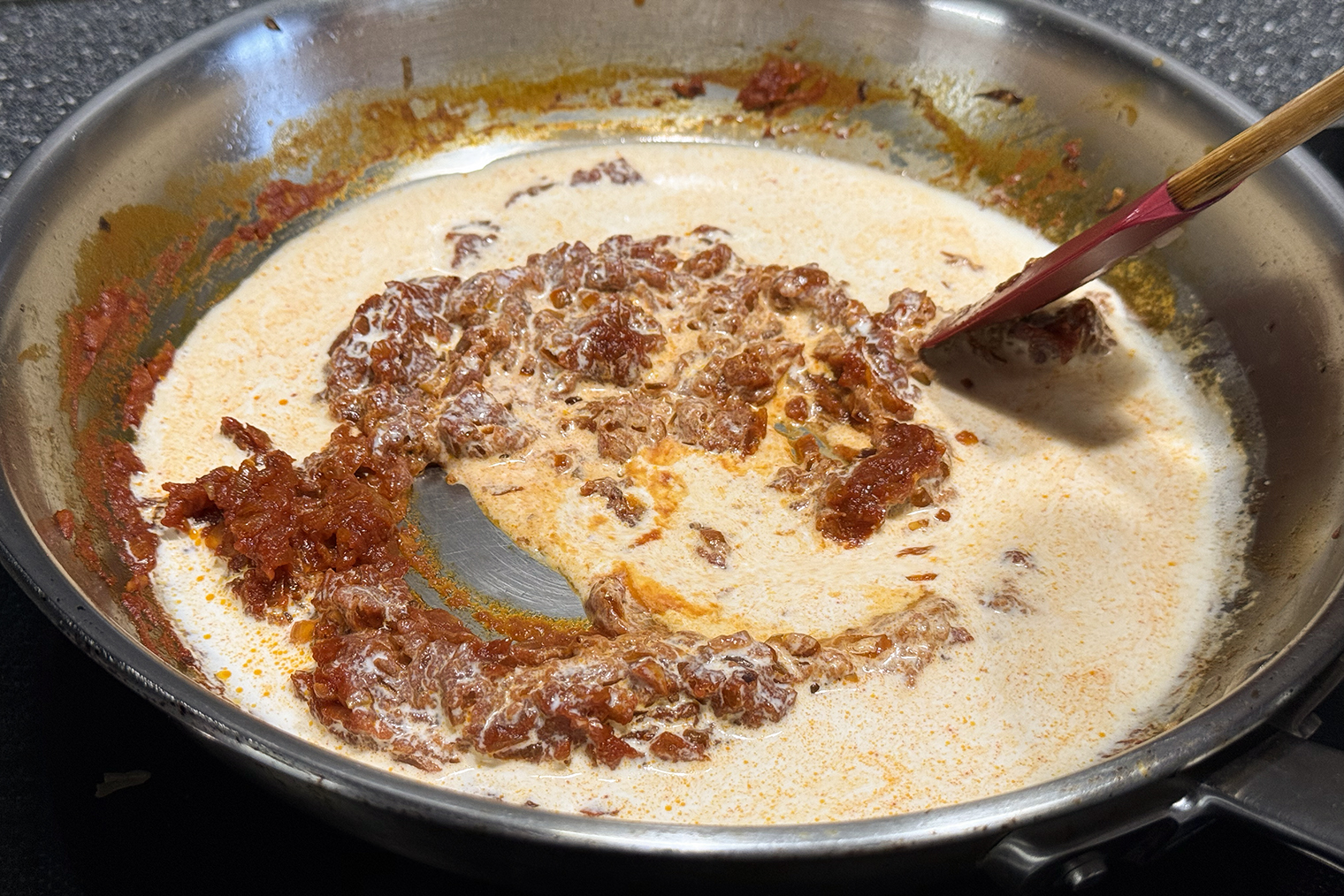 Томатно-сливочная смесь должна быть консистенции сметаны. Если соус кажется вам слишком густым, добавьте еще немного воды.