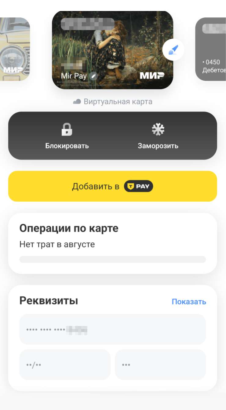 К T-Pay можно привязать до 10 карт Т-Банка платежной системы «Мир»: пластиковых, виртуальных, дебетовых, кредитных и дополнительных. Как это сделать: