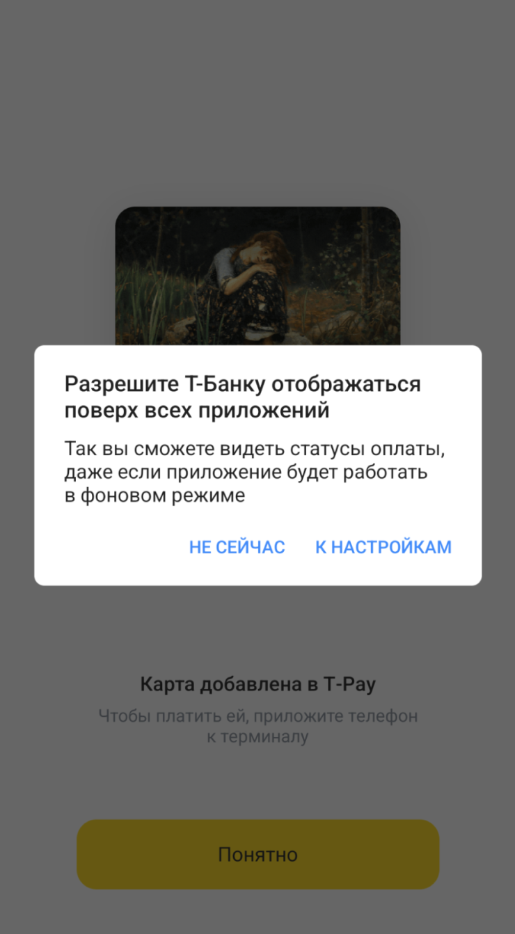 Если вы не видите кнопку «Добавить в T-Pay», убедитесь, что используете последнюю версию приложения, на смартфоне нет прав суперпользователя и установлена оригинальная прошивка. Кнопка не показывается для карт зарубежных платежных систем.