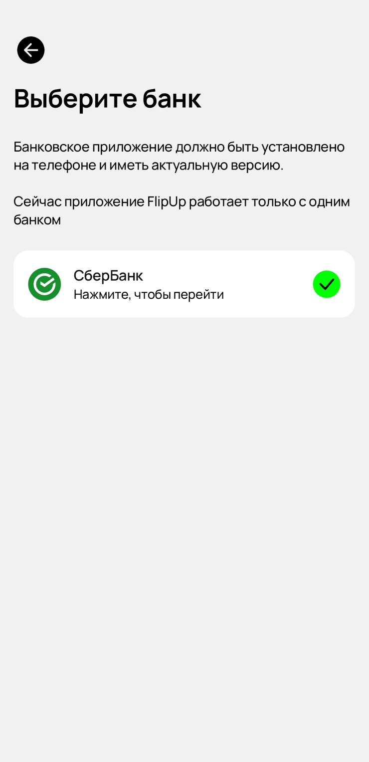 Шаг 2. Подключите карту в аппе FlipUp. Для этого нажмите в приложении кнопку «Подключить карту» и следуйте простой инструкции. В процессе понадобится подтвердить привязку карты в приложении Сбера. После этого от банка поступит смс.