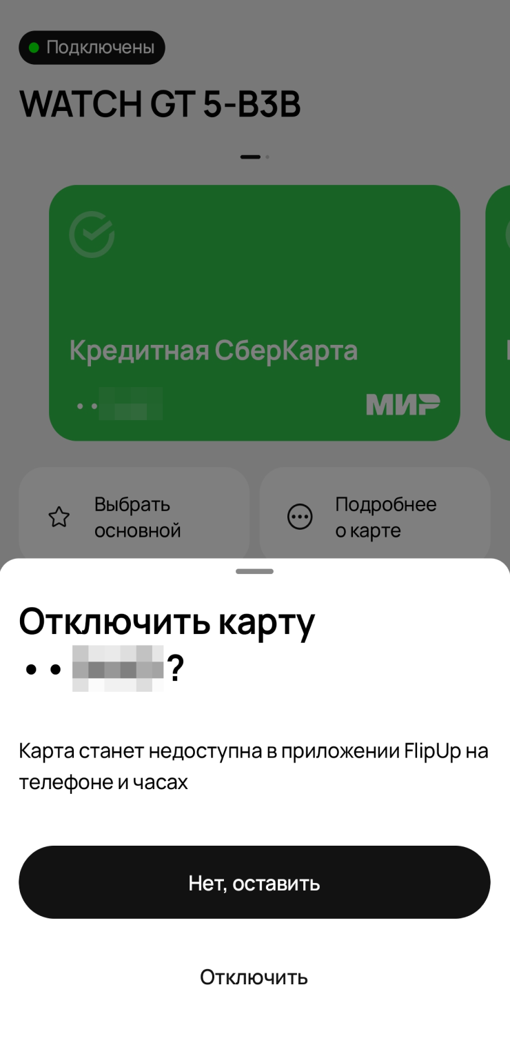 В настройках приложения FlipUp есть требование о сопряжении часов со смартфоном. По факту оплата часами Huawei Watch GT 5 срабатывает и без этого — и даже если смартфон остался дома. Но я все же рекомендую держать его поблизости: токены для оплаты могут закончиться в любой момент.
