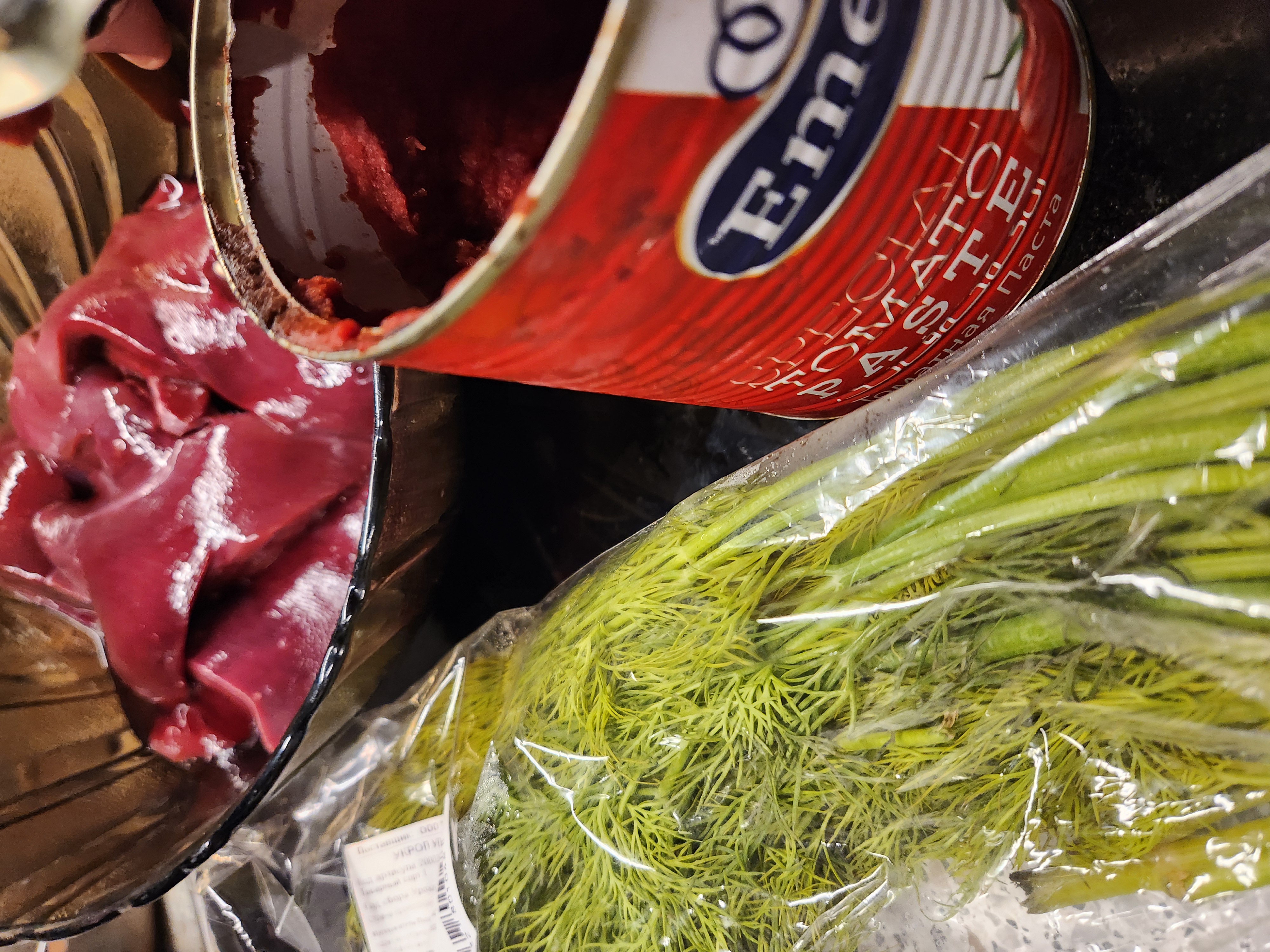 Просто ставлю на плиту в кастрюле субпродукты, заливаю их сверху томат-пастой, добавляю любых овощей, зелени и специй, и готовлю 20-30 минут на небольшом огне.