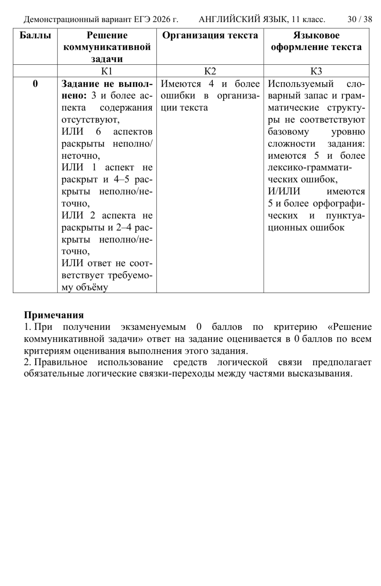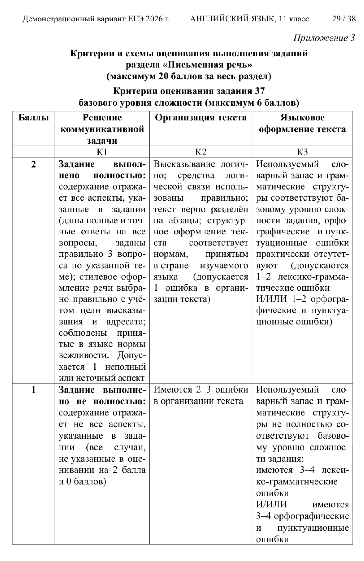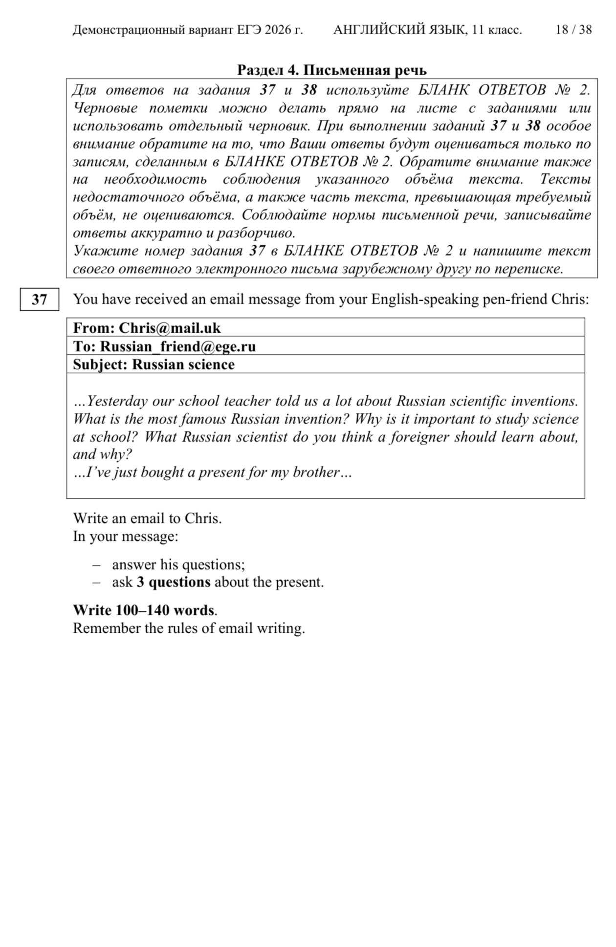 Также в письменной части два задания с развернутым ответом. В задании № 37 просят написать письмо своему другу. Объем — от 100 до 140 слов. Ответ оценивают по трем критериям, за каждый можно получить по 2 балла, всего — 6: