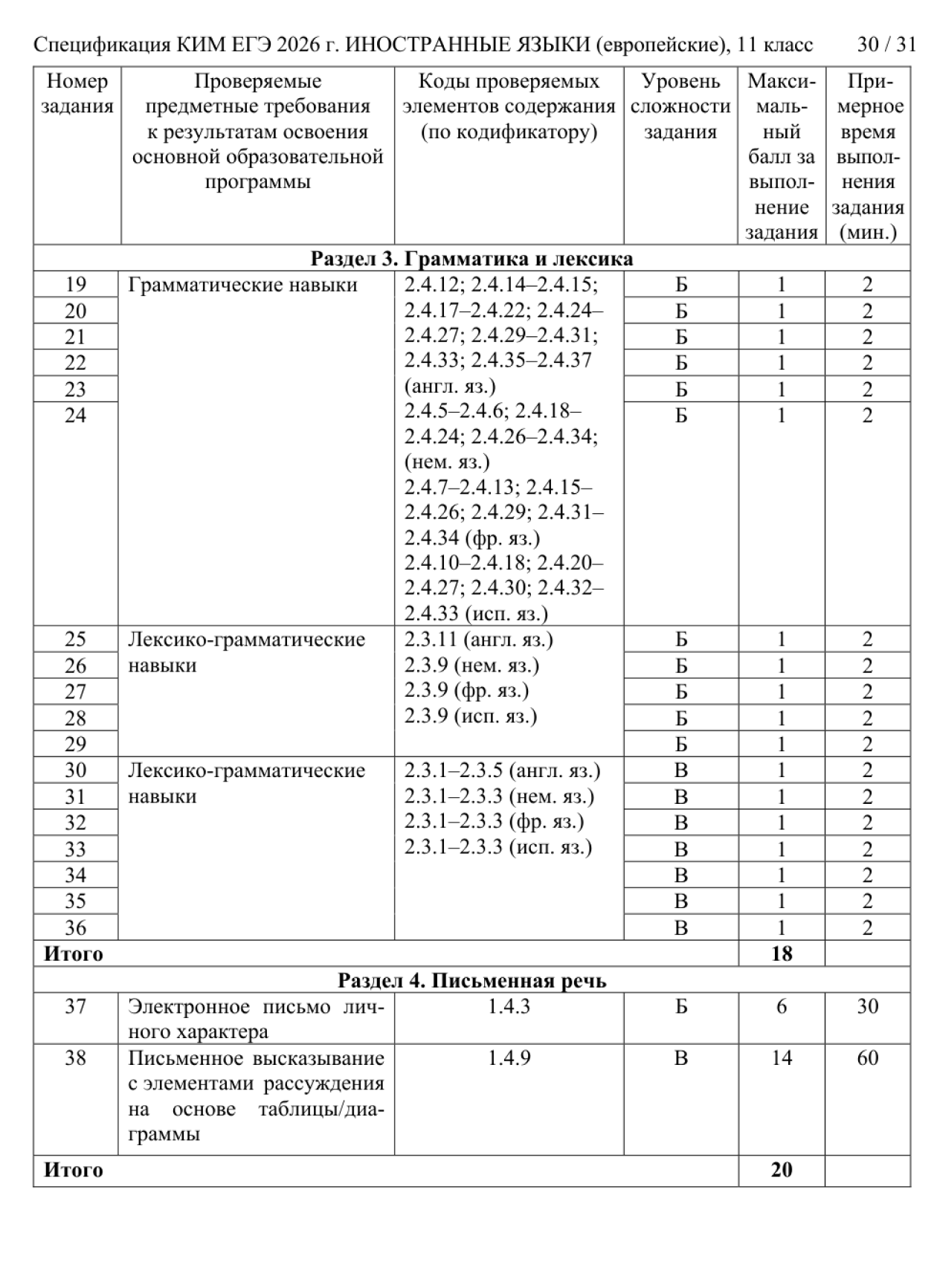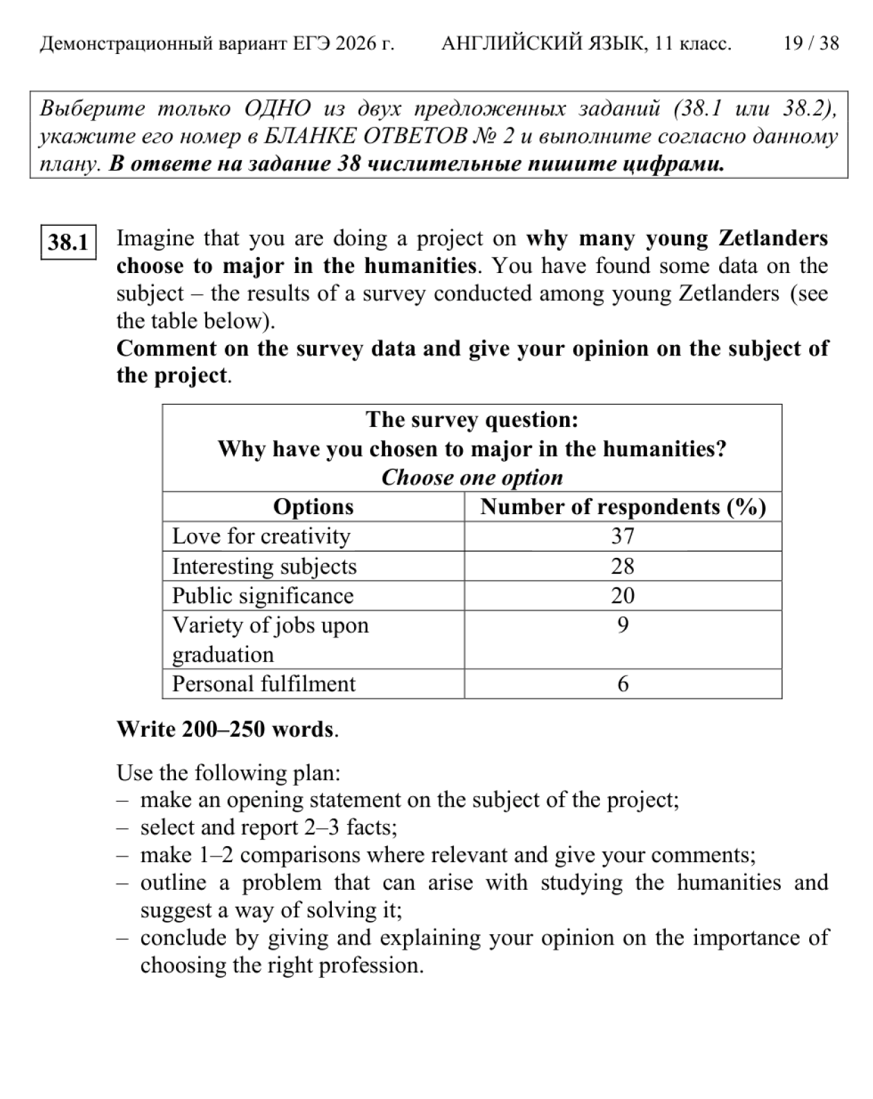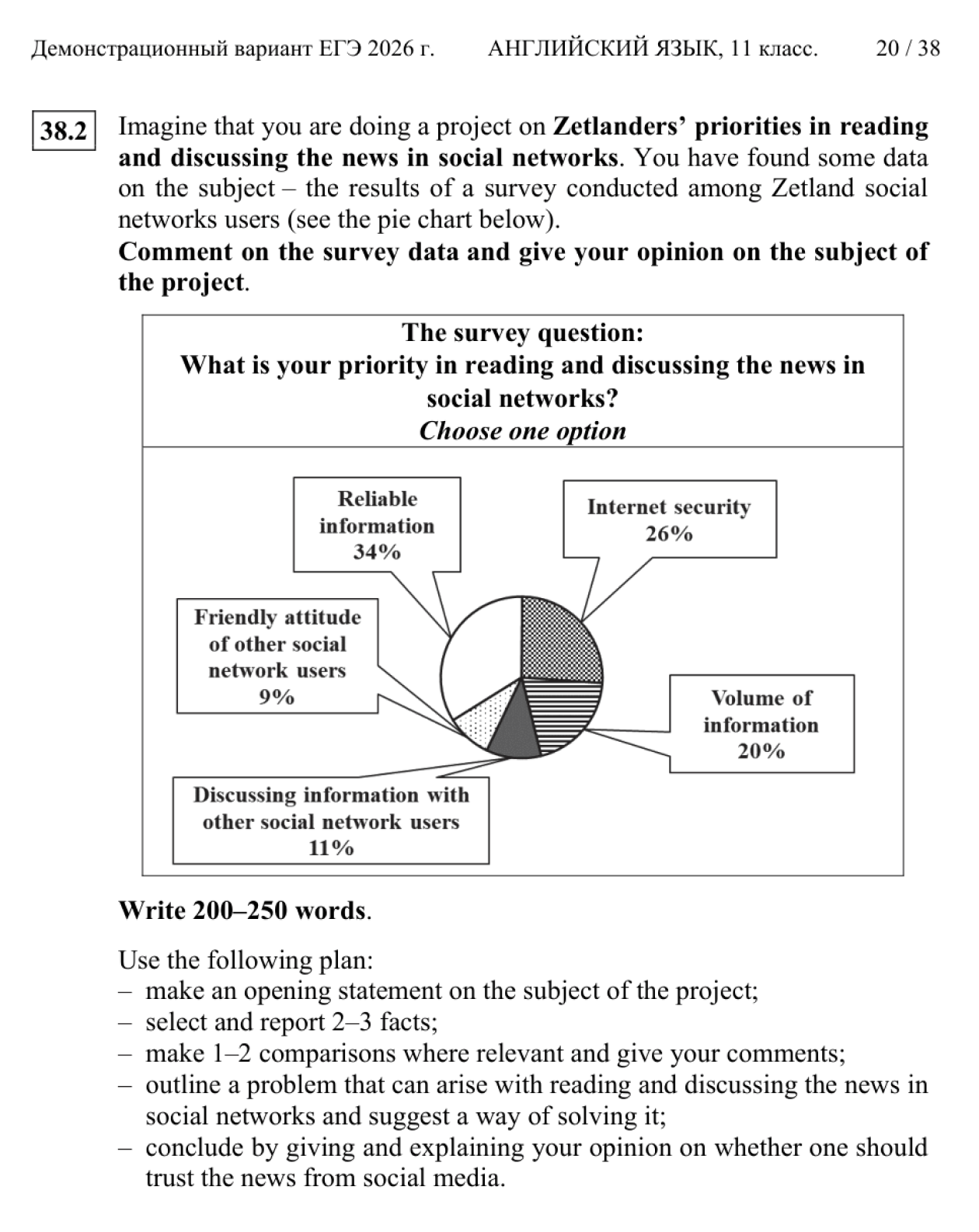 Также в письменной части два задания с развернутым ответом. В задании № 37 просят написать письмо своему другу. Объем — от 100 до 140 слов. Ответ оценивают по трем критериям, за каждый можно получить по 2 балла, всего — 6: