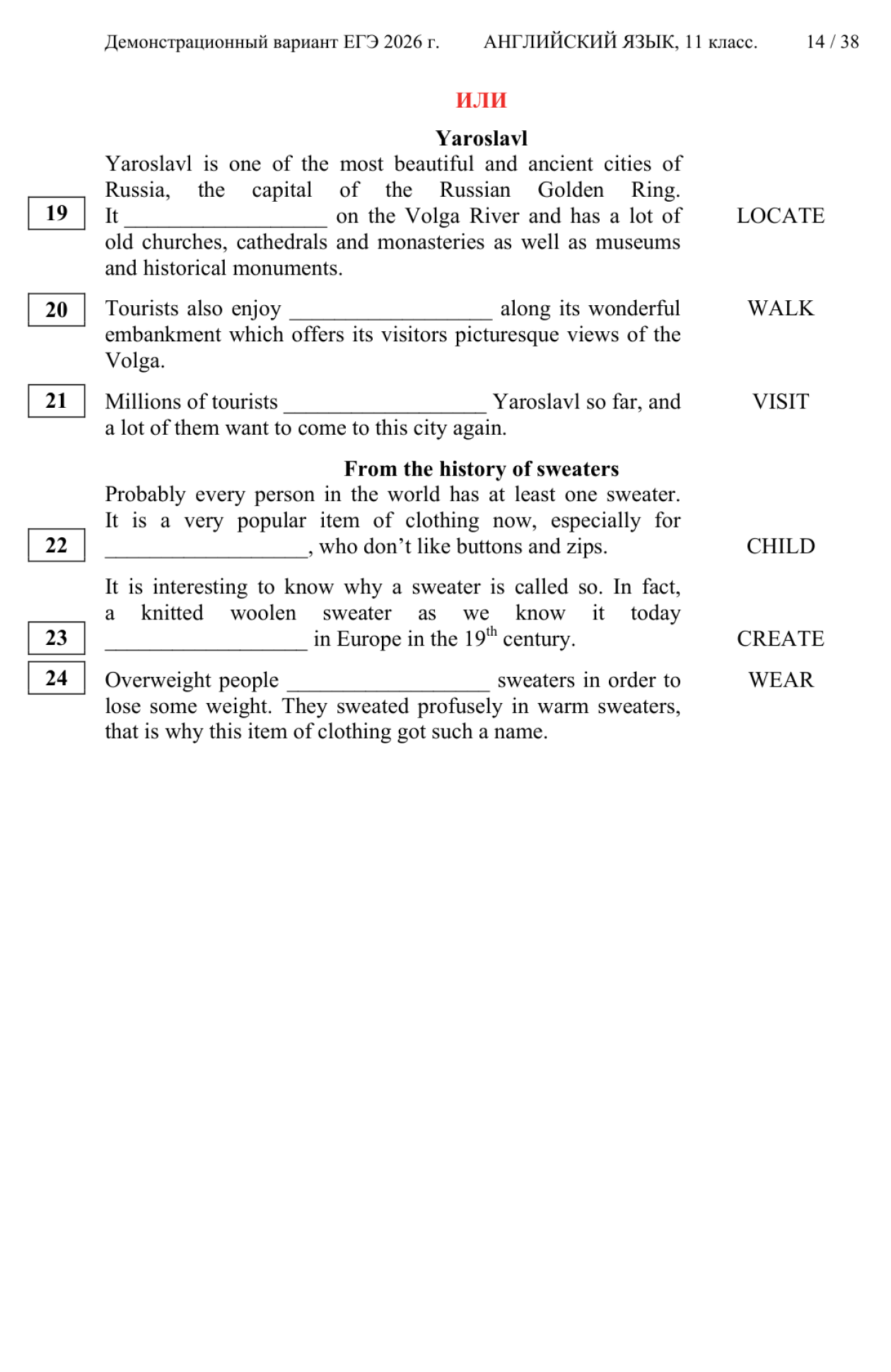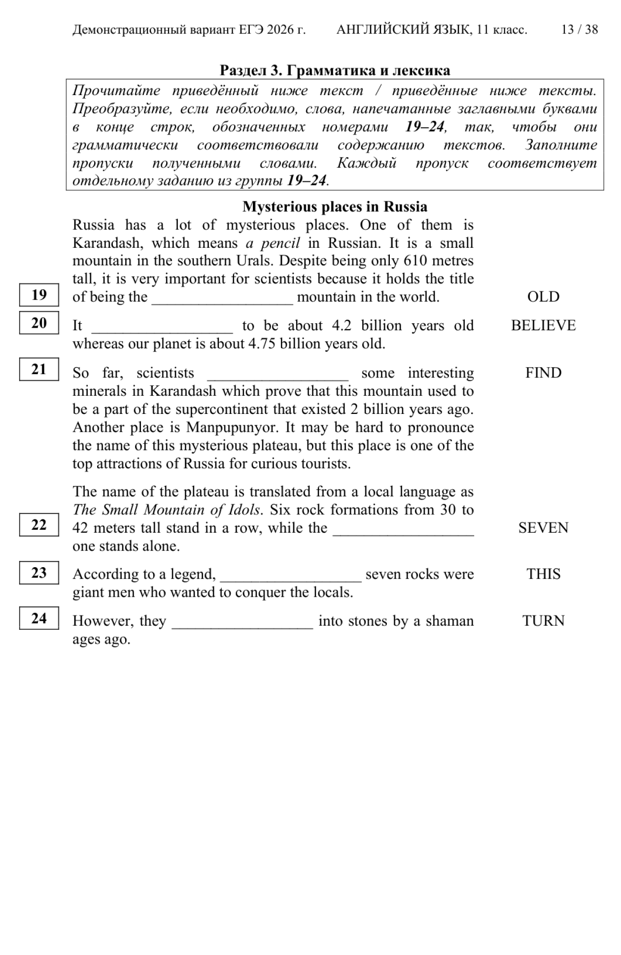 В заданиях № 19—24 на грамматику можно выбрать один большой текст или два поменьше. Вопросы № 30—36 предполагают краткий ответ одним словом.