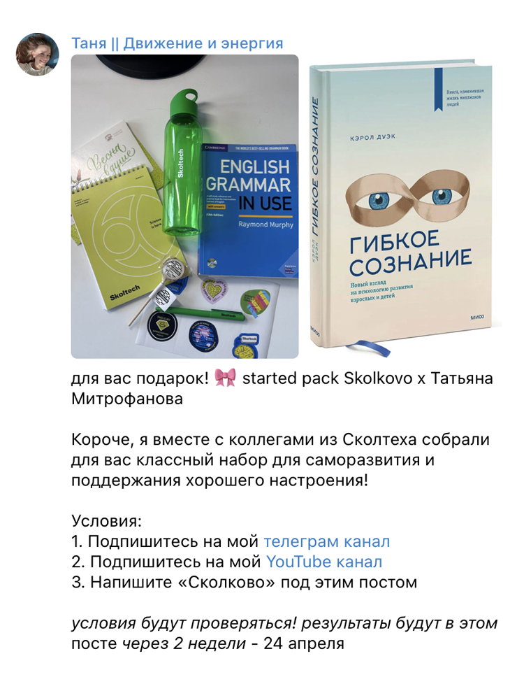Подписчики часто спрашивают меня, как попасть в Сколтех. Одну девушку я даже порекомендовала эйчару — и ей сделали оффер. Я знаю, что некоторые крупные компании платят сотрудникам за продвижение эйчар‑бренда — у нас такой практики нет, но было бы здорово.