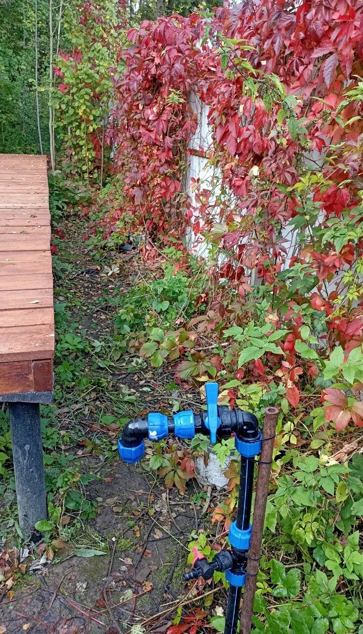 Муж собрал из труб и вентилей колонку с водой: сама вода в СНТ летняя и идет по трубе снаружи участка. Он подключился, провел трубу ближе к домику, использовал найденный металлический прут и за него закрепил «колонку» вертикально. Так появилась удобная вода, которую можно перекрывать. Заняло часа два.