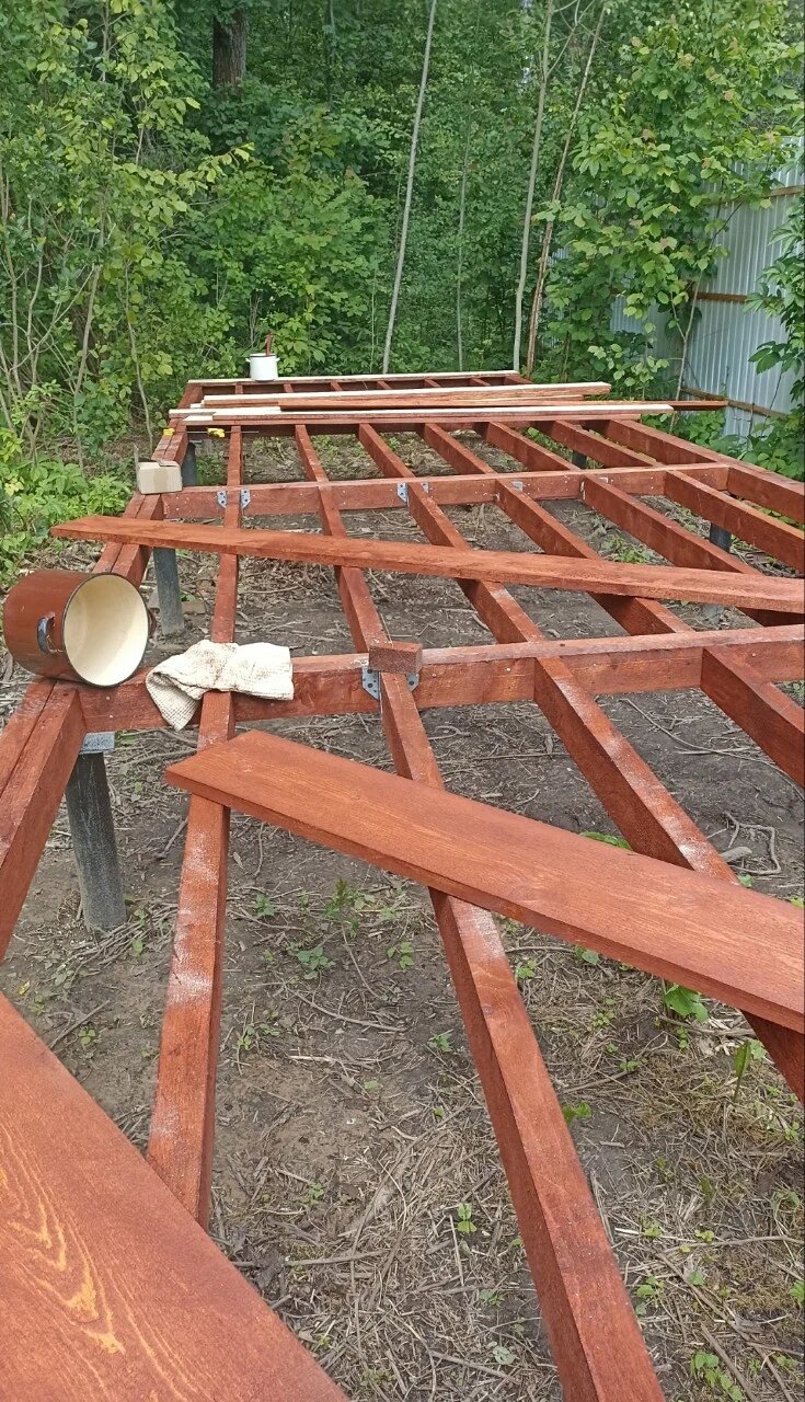 Такая физическая нагрузка нам понравилась! (дни были не подряд, а с перерывами). Я красила все доски универсальным средством: и защита от всего и тонирование в оттенок «тик». На этом стройка остановилась, мы закрыли тентом на зиму построенную «палубу» и ступеньки для нее, и продолжение постройки планируется на конец весны 2026.