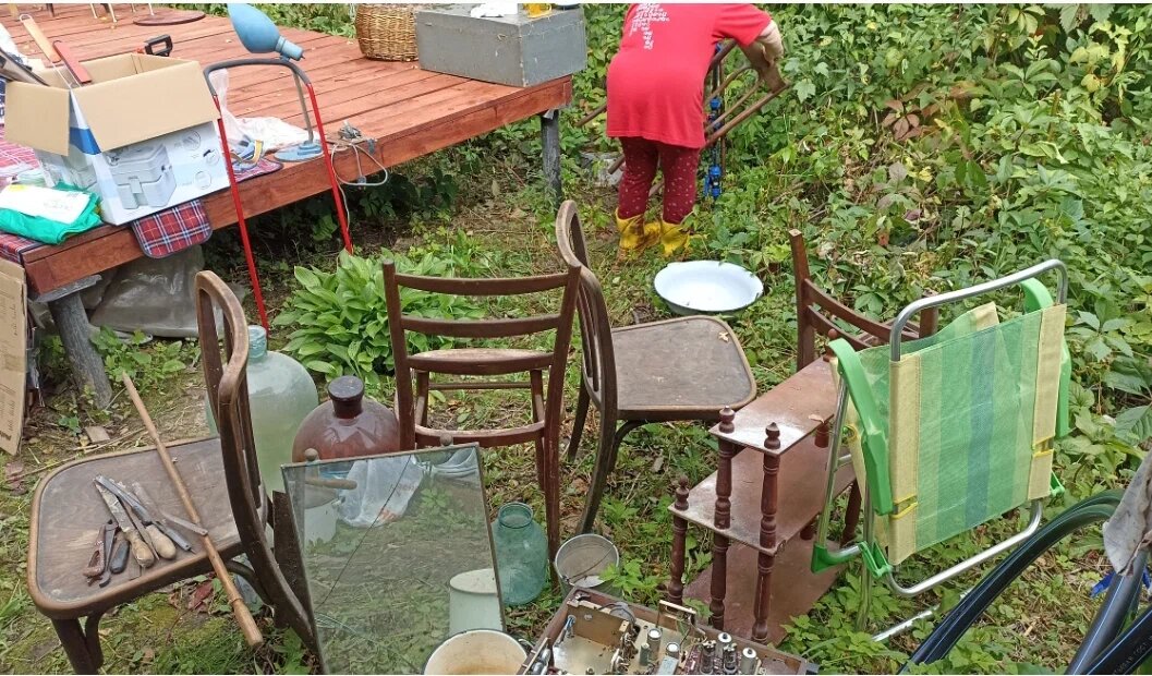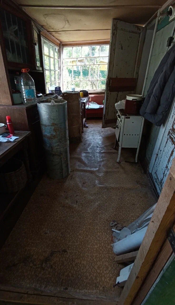 Несмотря на знание, что домик под снос, летом мы устроили Отмывочный выходной! Я позвала маму и подругу, и втроем мы принялись его отмывать. Привезли пылесос, кучу моющих средств, взяли одноразовые белые костюмы, очки, маски. Вытащили кучу мебели на улицу и помыли ее — стулья, этажерки. Все явно сломанное — на выброс, но такого немного оказалось.