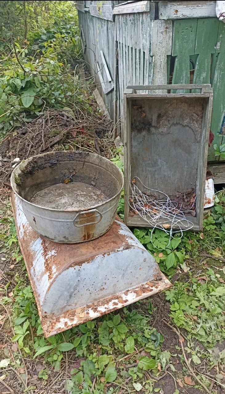 На участке в траве и земле (закопанные) встречались: бетонные балки (поднять только вдвоем); железные пруты и детали, металлические ржавые шланги; бутылки и емкости с засохшими удобрениями; четыре двери из массива дерева (очень поврежденного и очень тяжелого, потому что сырые насквозь) — их пришлось пилить, просто чтобы поднять из земли; гора мусора размером с клумбу (именно там, где мы хотим костровую зону), ржавые инструменты (пару топоров мы оставили); ведра и бидоны, килограммы слипшихся гвоздей, рулоны сетки.