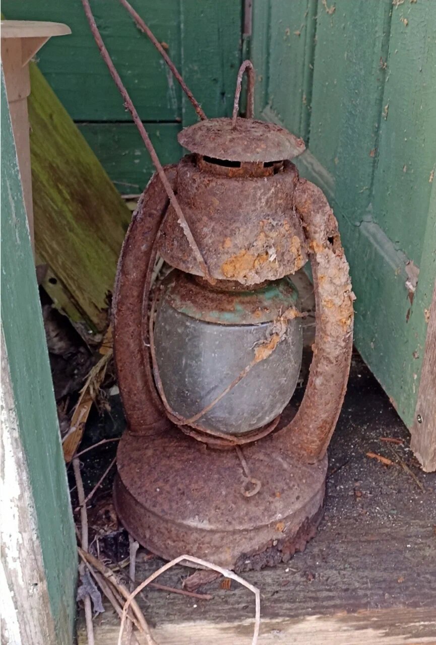 В земле мы тоже находили некоторые вещи: очень ржавая, но целая керосиновая лампа, как в кино. Дощечка вроде чеканки с мини-вентилятором спереди. Старая табличка с цифрой — номер домика в СНТ.