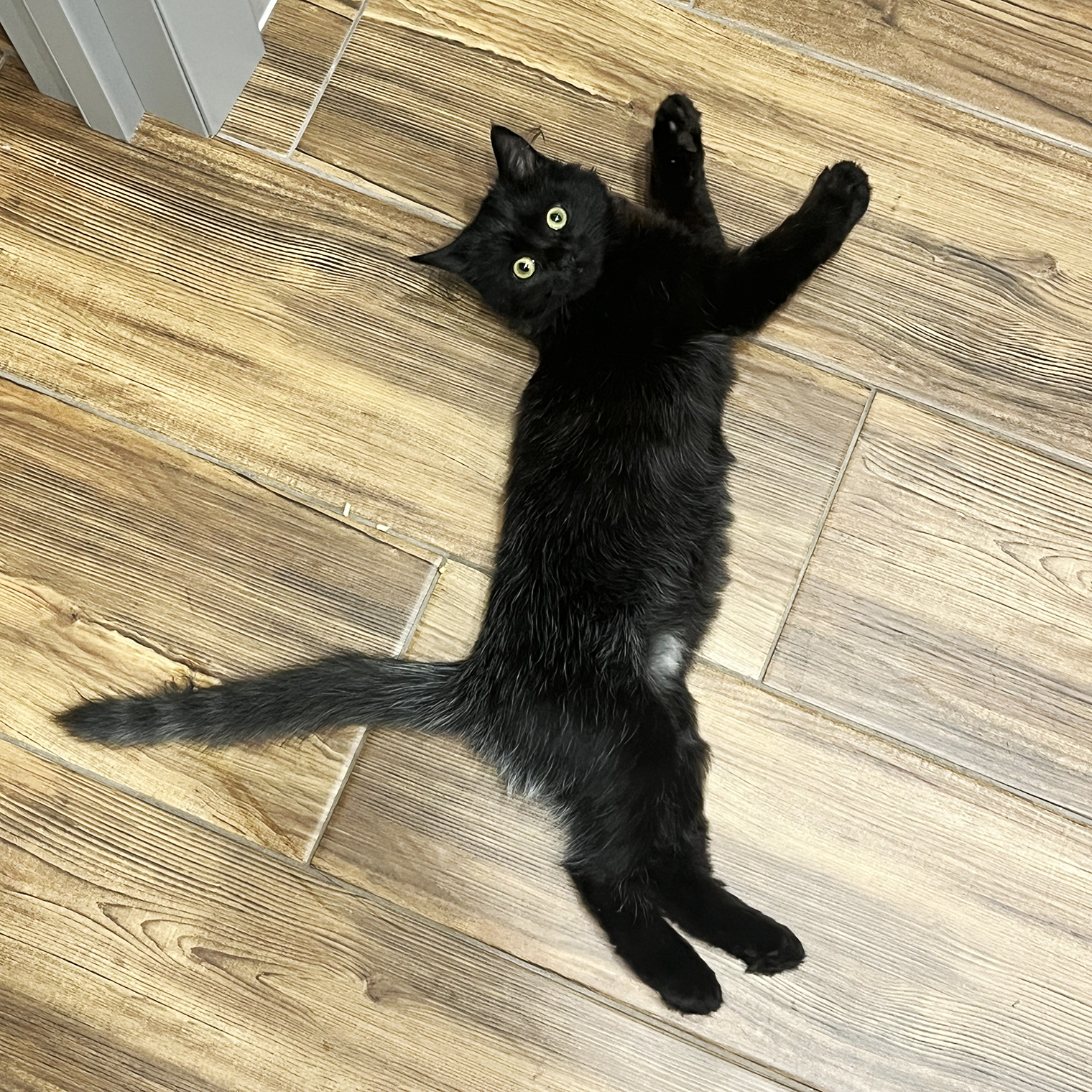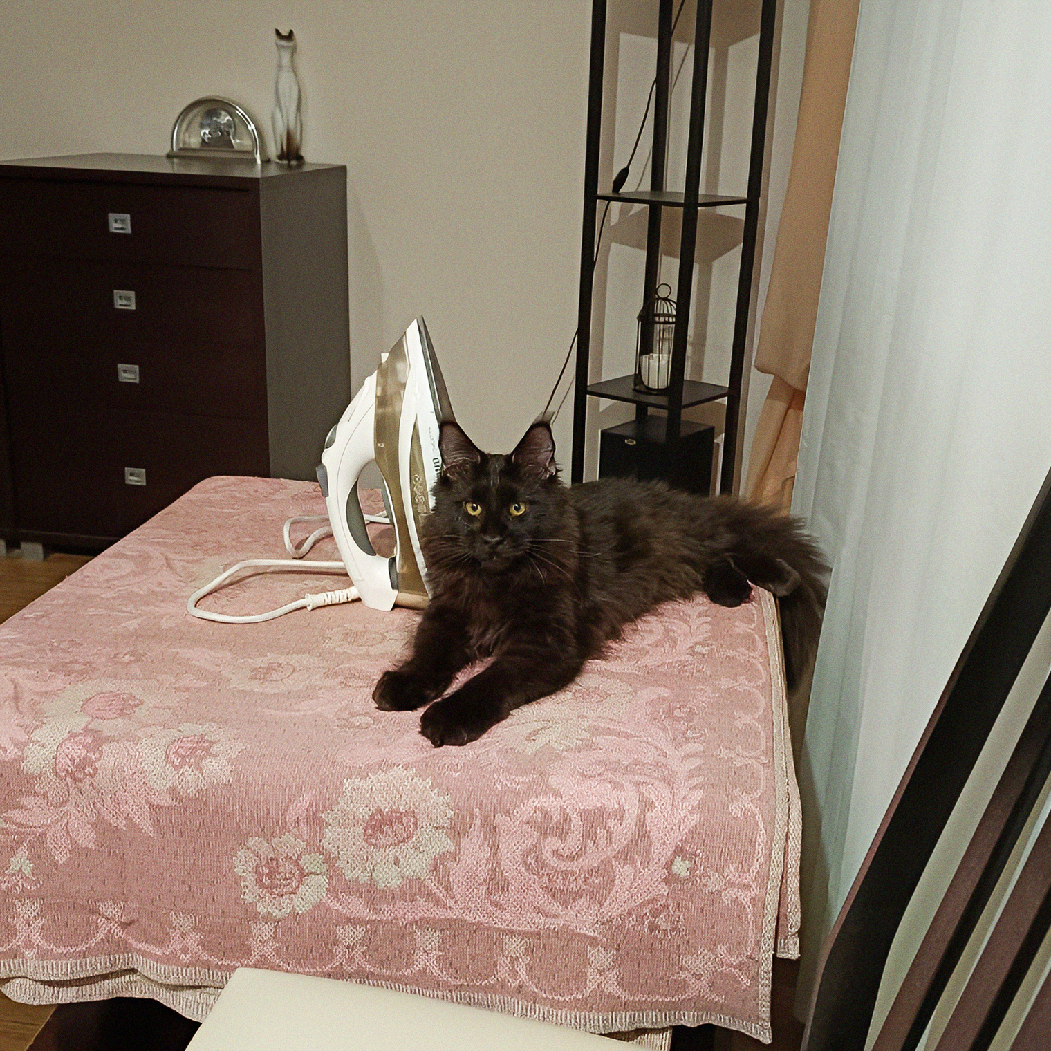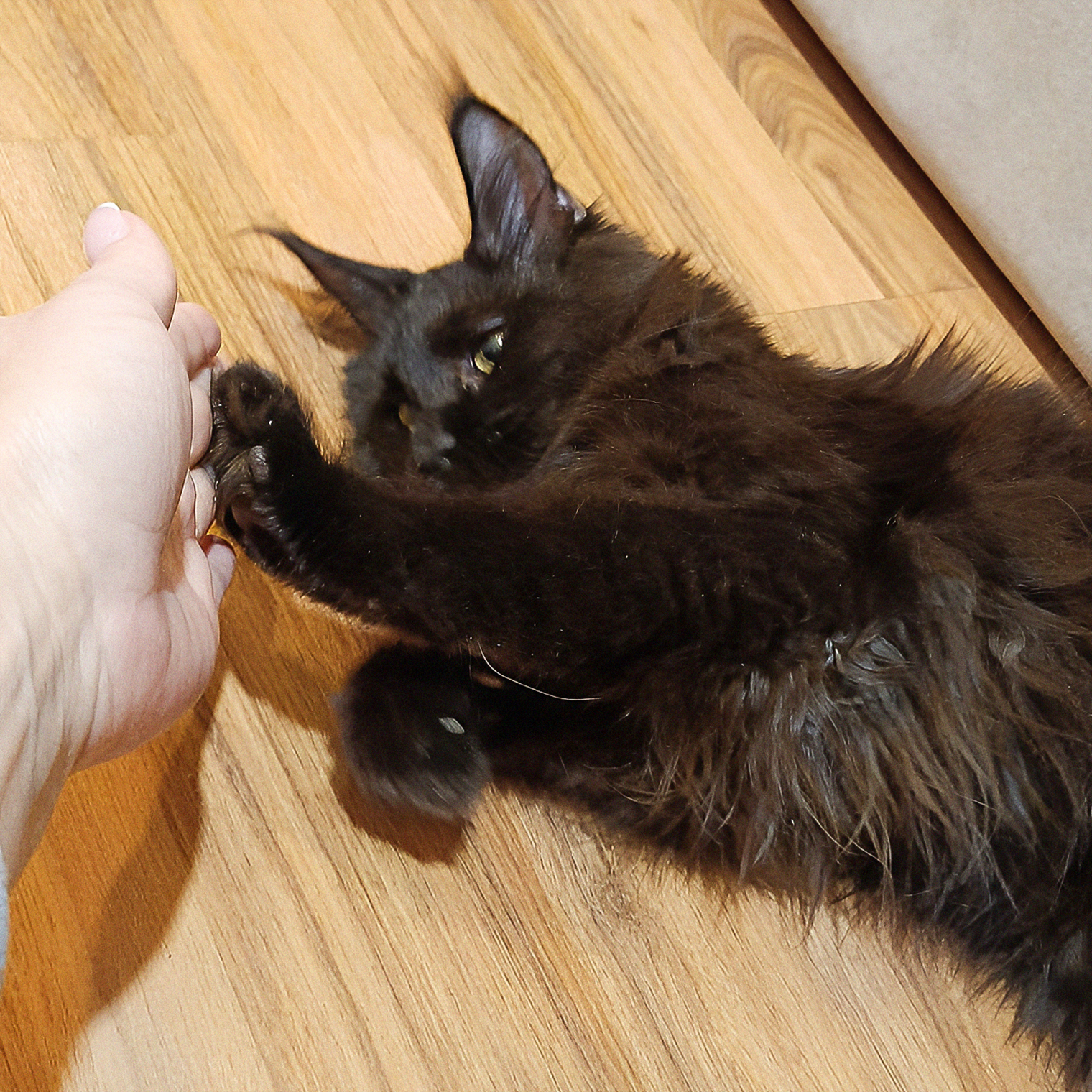 Сейчас она превращается в элегантную мадам, а окрас все так же удивляет: тотал-блэк с проседью, полосатый хвост и рыжеватый шарфик. Она быстро растет, превращаясь в булгаковского Бегемота.