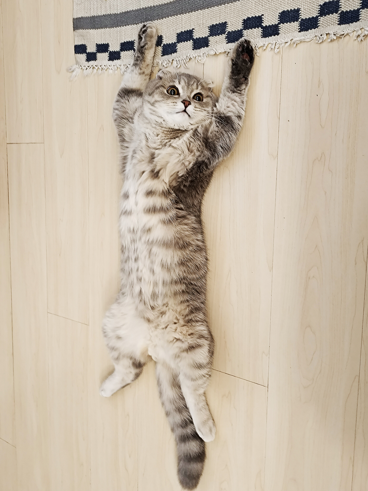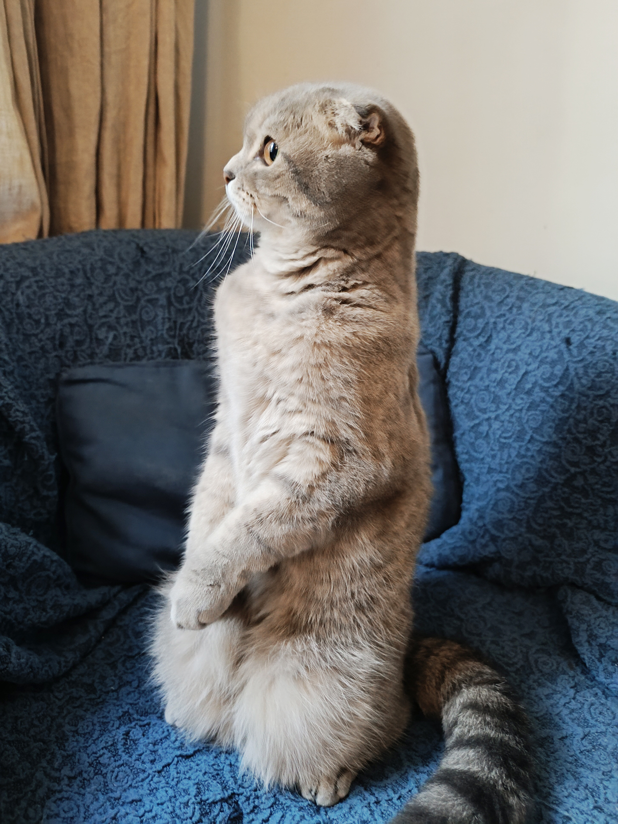 Наш котик — мастер принимать забавные позы. Но в последнее время фаворитом стала поза суслика. Часто и подолгу может так стоять. Читала где-то, что это одна из особенностей шотландских вислоухих.