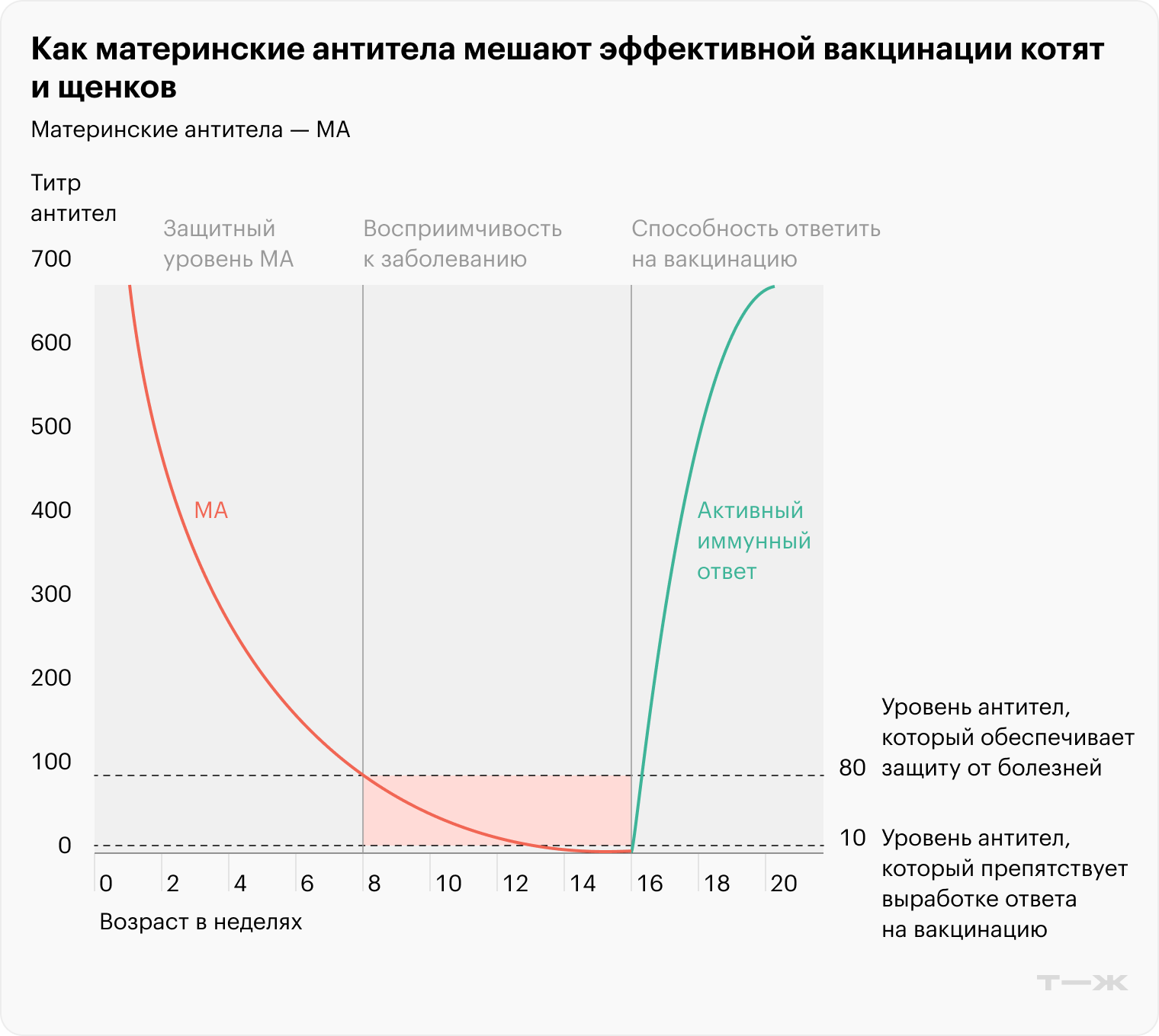 Большинство котят в первые недели жизни защищает колостральный иммунитет — это антитела, которые мама передала им вместе с молоком. Если вакцинировать котенка в этот период, мамины антитела справятся с возбудителем — и собственный иммунитет не выработается.