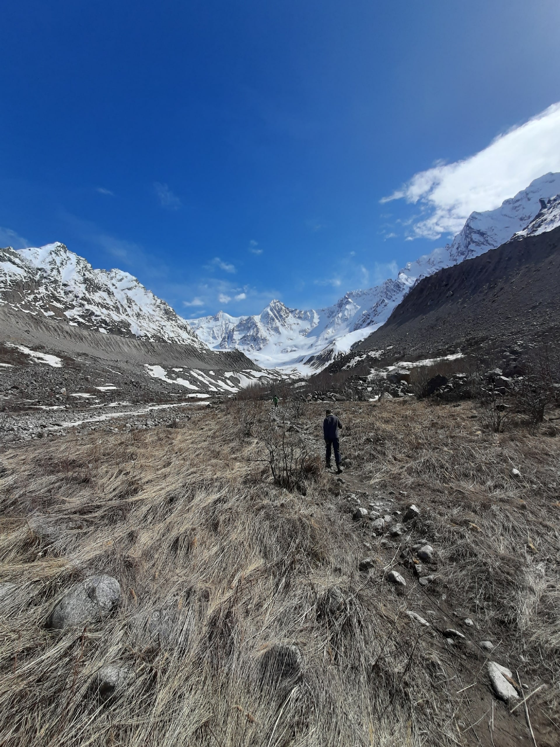 Были в горном походе на Кавказе, близ горы Тихтиген. Пеший выход к леднику Шаурту, впереди гордо вышагивает сын