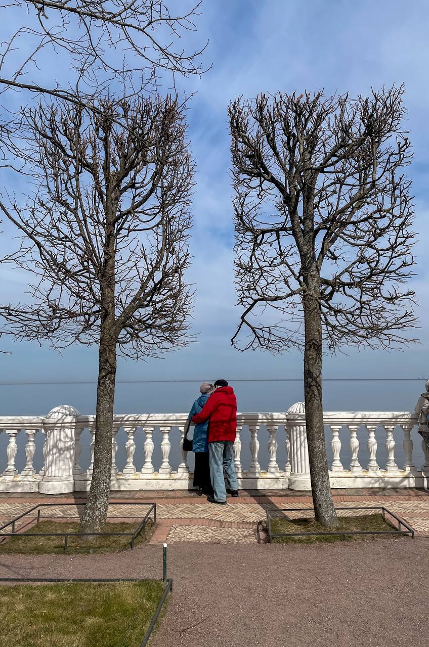 В воскресенье выбралась в Петергоф и прогуливаясь, заметила эту пару, любующуюся на залив. Мне понравилось, как красиво падают тени от деревьев и как красная куртка выделяется на фоне воды.