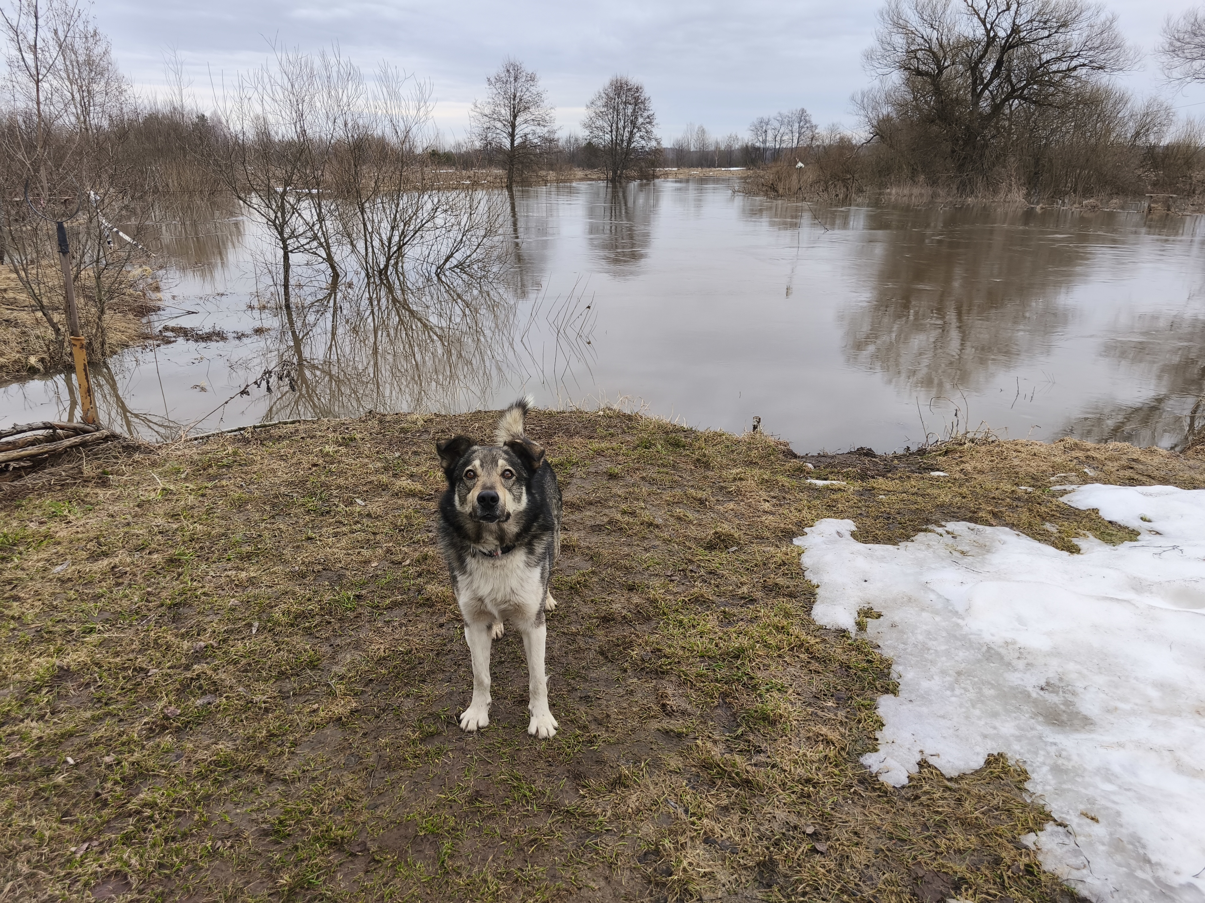 Бездомный деревенский пёс Тарбармошка радуется всему хорошему в этой жизни. Вот и разливу местной речки — тоже.