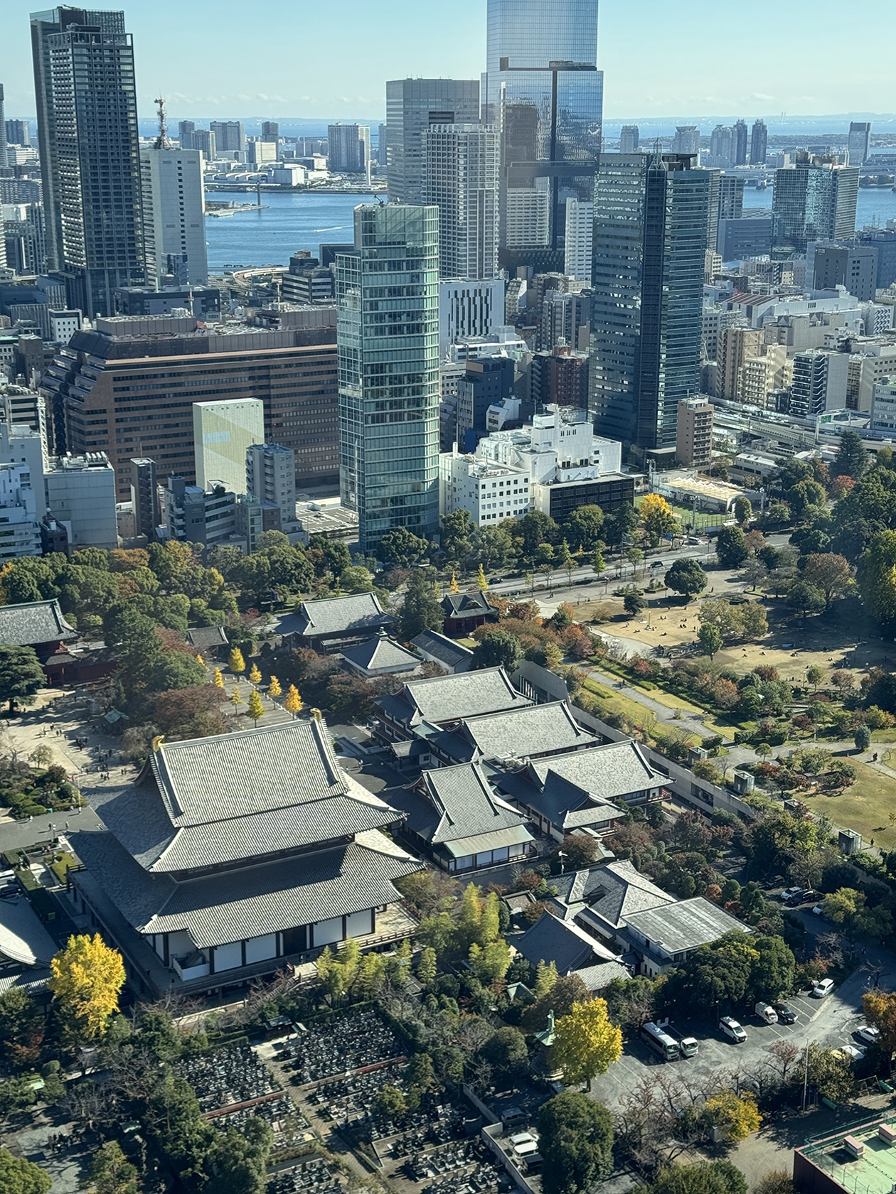 Вид на город и залив с телевизионной башни. Это уже ближе к концу ноября, а деревья все еще зеленые и немного желтые. Особенно порадовало кладбище внизу: я очень боюсь высоты и в шутку решила, что это плохой знак