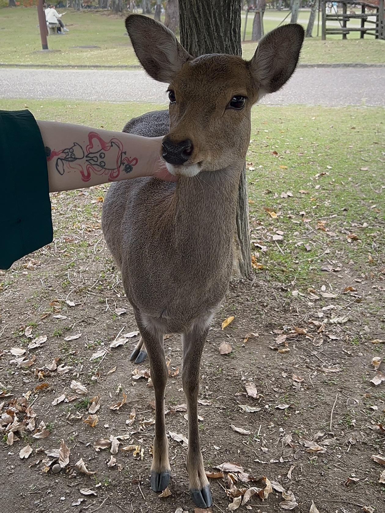 Про Нару наверняка многие слышали. Это бывшая японская столица с кучей оленей. Их и правда много, у входа в парк они даже немного агрессивные: готовы бегать за туристами и бодать их, чтобы получить крекеры. Меня пырнули рогом в бедро, и синяк красовался целый месяц. В центре парка олени уже более спокойные, удалось спокойно покормить и погладить эту милашку на фото