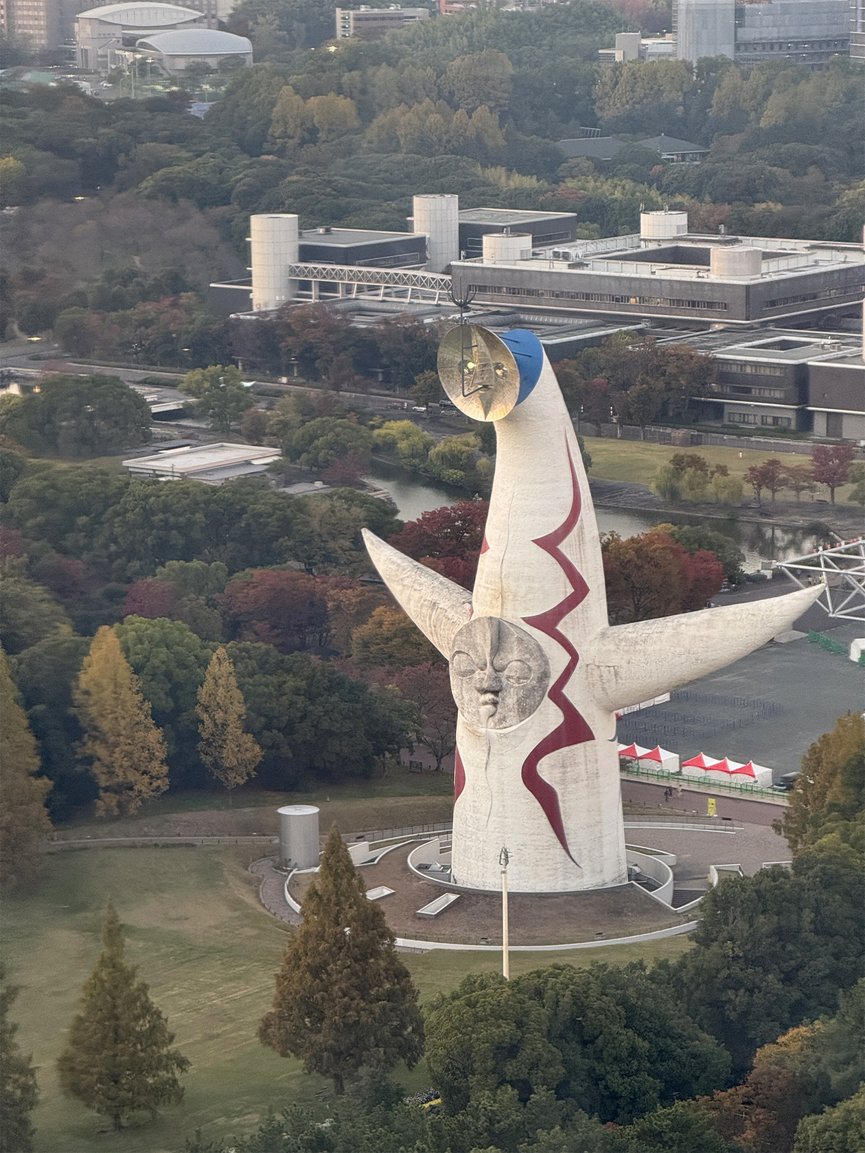 Башня Солнца в Осаке, которую построили к всемирной выставке 1970 года. Поближе посмотреть не удалось: парк закрывался рано. Поэтому полюбовалась ею с колеса обозрения, самого высокого в Японии