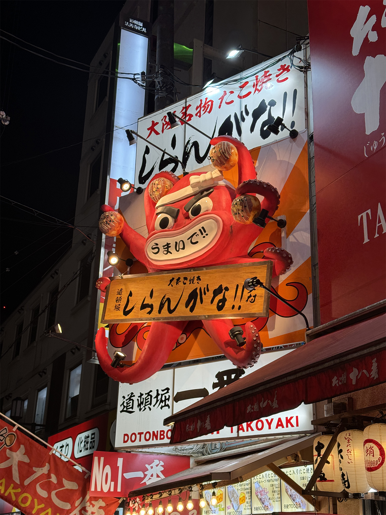 В районе Дотонбори в Осаке на туристов с вывесок смотрят осьминоги разного уровня злости. Здесь на каждом шагу можно попробовать такояки — фирменное местное блюдо в виде шариков из теста с начинкой из осьминога