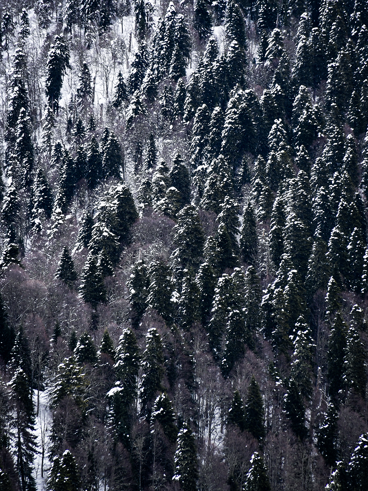 Заснеженный склон с густым хвойным лесом, среди которого пряталась заснеженная тропа