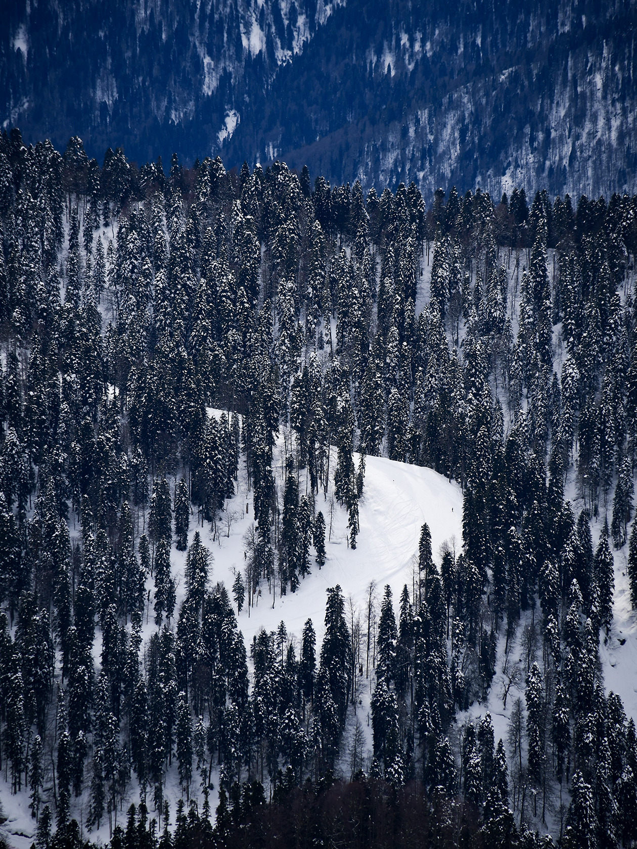 Меня привлек контраст хвойного леса и снежного склона
