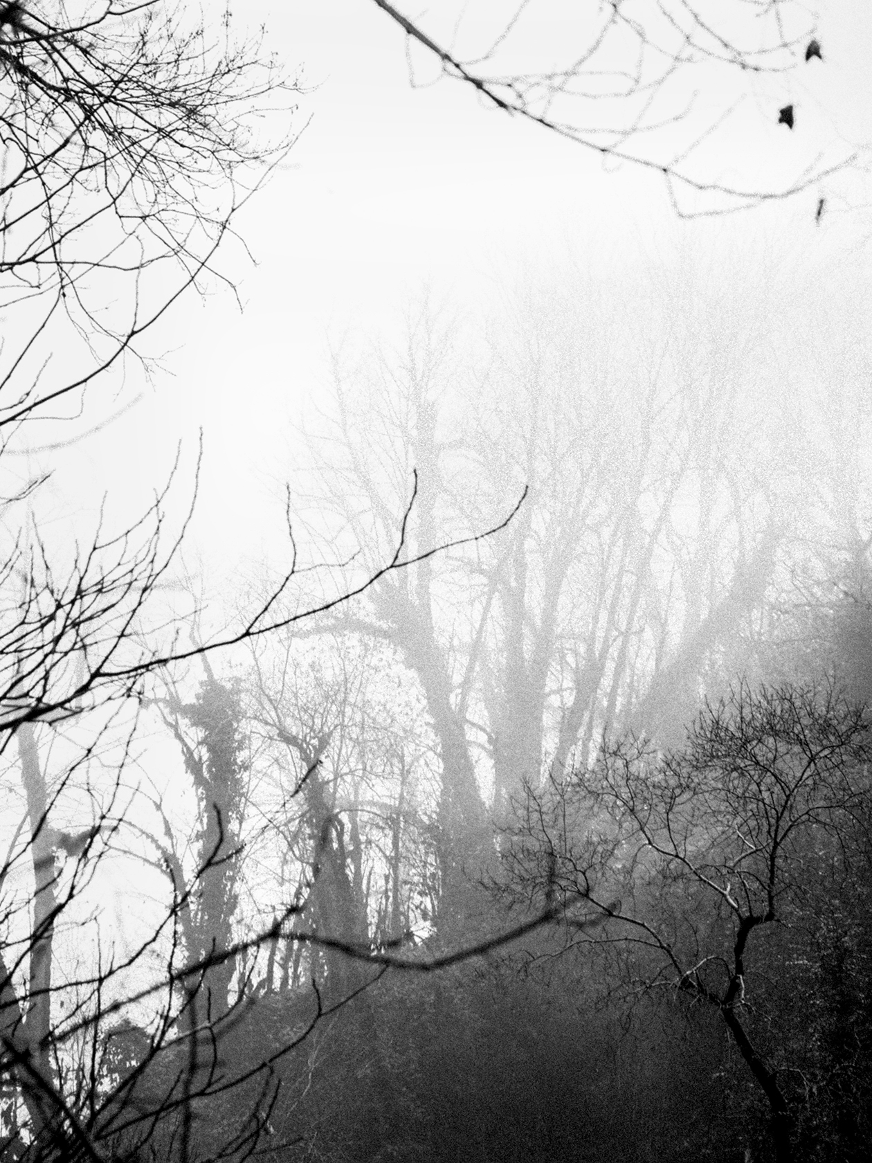 Лес Сочи в холодном рассеянном тумане, где виднелись только силуэты деревьев