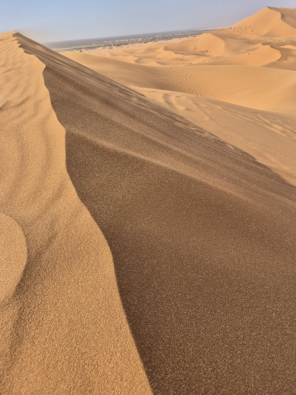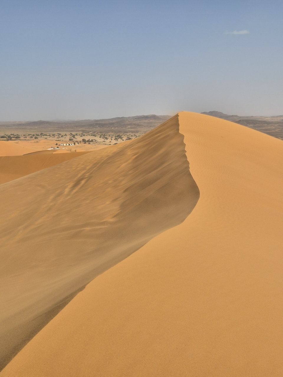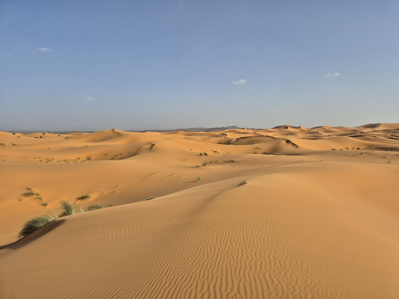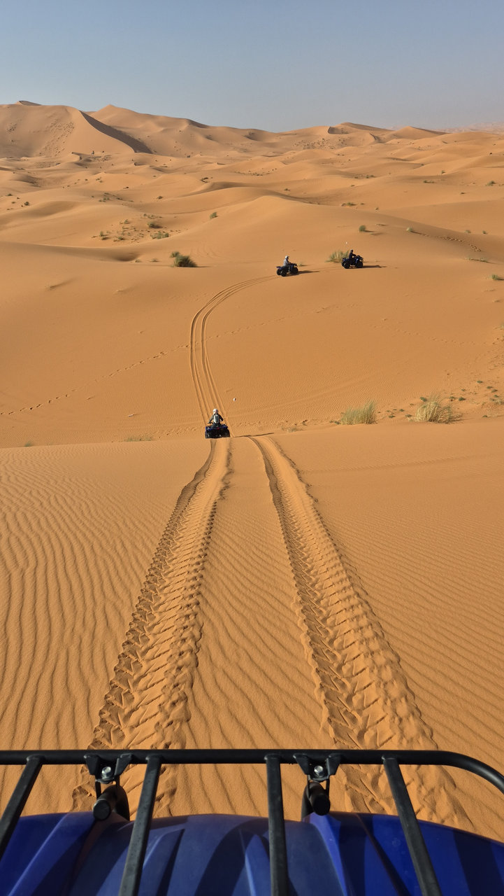 Доехали до деревни Мерзуга, заселились в отель. Ну, как отель, берберский домик из навоза и палок. Поспрашивали цены на квадроциклы в разных компаниях, немного поторговались, договорились на 2 часа по 25 €/час с человека. Нас было 3 человека. Других туристов не было, поэтому сразу же надели шлемы и маски, прошли экспресс-обучение по управлению квадроциклами, сели на них и поехали вместе с гидом. Дорога идет прямо по границе пустыни, поэтому сразу же оказались на песчаных барханах. Первые полчаса ездили аккуратно, потом освоились, начали лихачить. В принципе хватило бы и одного часа, но два часа все-таки лучше. Вечером пошли гулять по барханам пешком, где и встретили закат.
