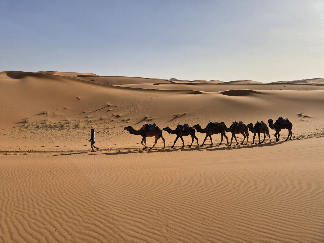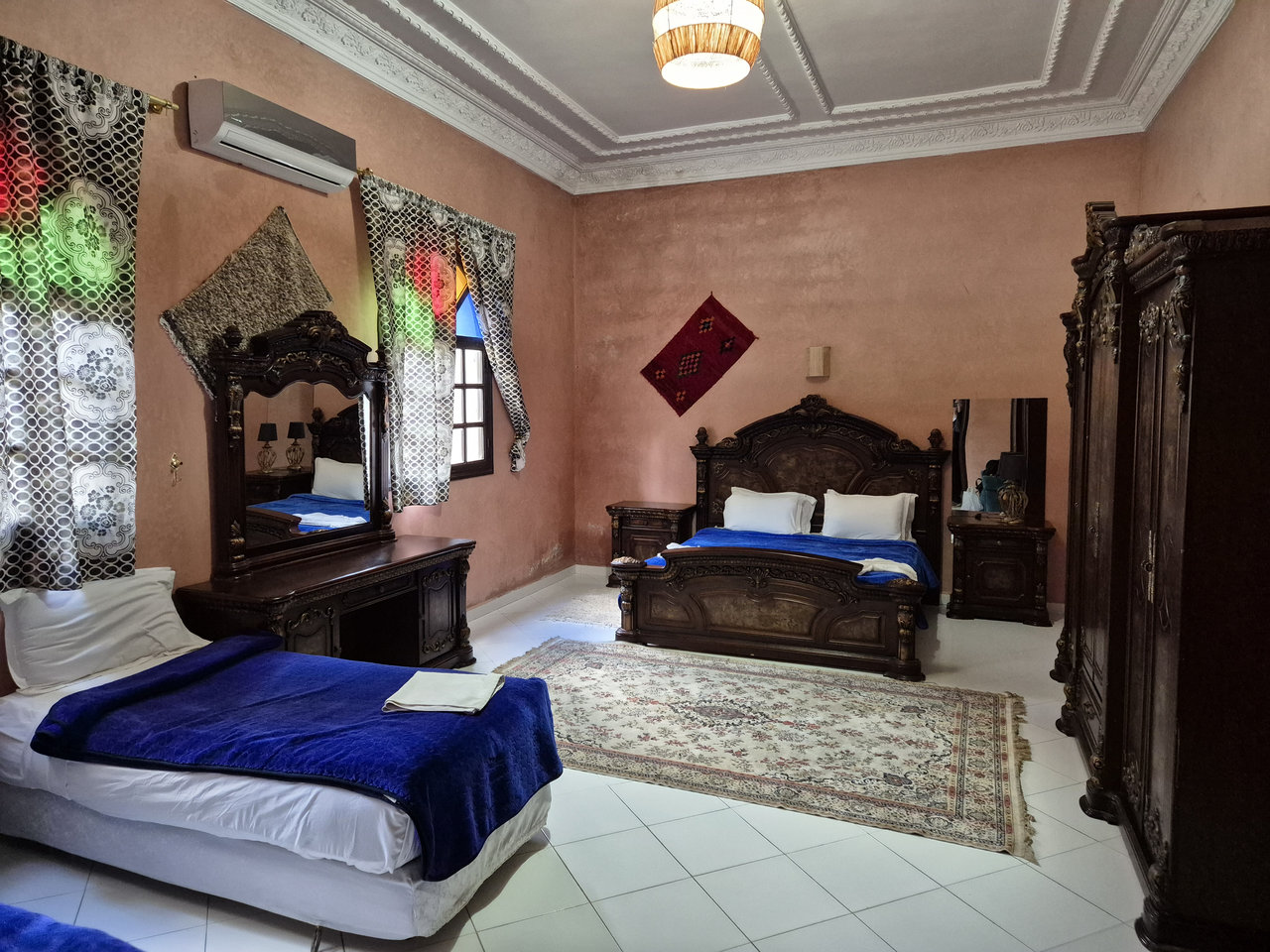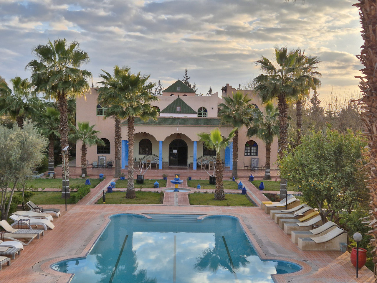 Путешествие заняло неделю: первую и последнюю ночи — в Марракеше, одну — в деревню Мерзуга (прямо у пустыни Сахара), по 2 ночи туда и столько же обратно. Дорога 500 км туда и столько же обратно, можно доехать и одним днем. Но мы неспешно ехали всего по 2-3 часа в день, по пути останавливались посмотреть ущелья, достопримечательности, сходить на хайкинг, пообедать в кафе и пр. Отелей очень много, полно свободных, стоят недорого, бронировал через Booking в тот же день, когда понимал, где окажемся к вечеру. Особенно понравился отель Riad Qodwa с огромной комнатой, потолками 5 метров, бассейном, садом, павлинами: стоит всего 31 €/ночь за троих, включая завтрак.
