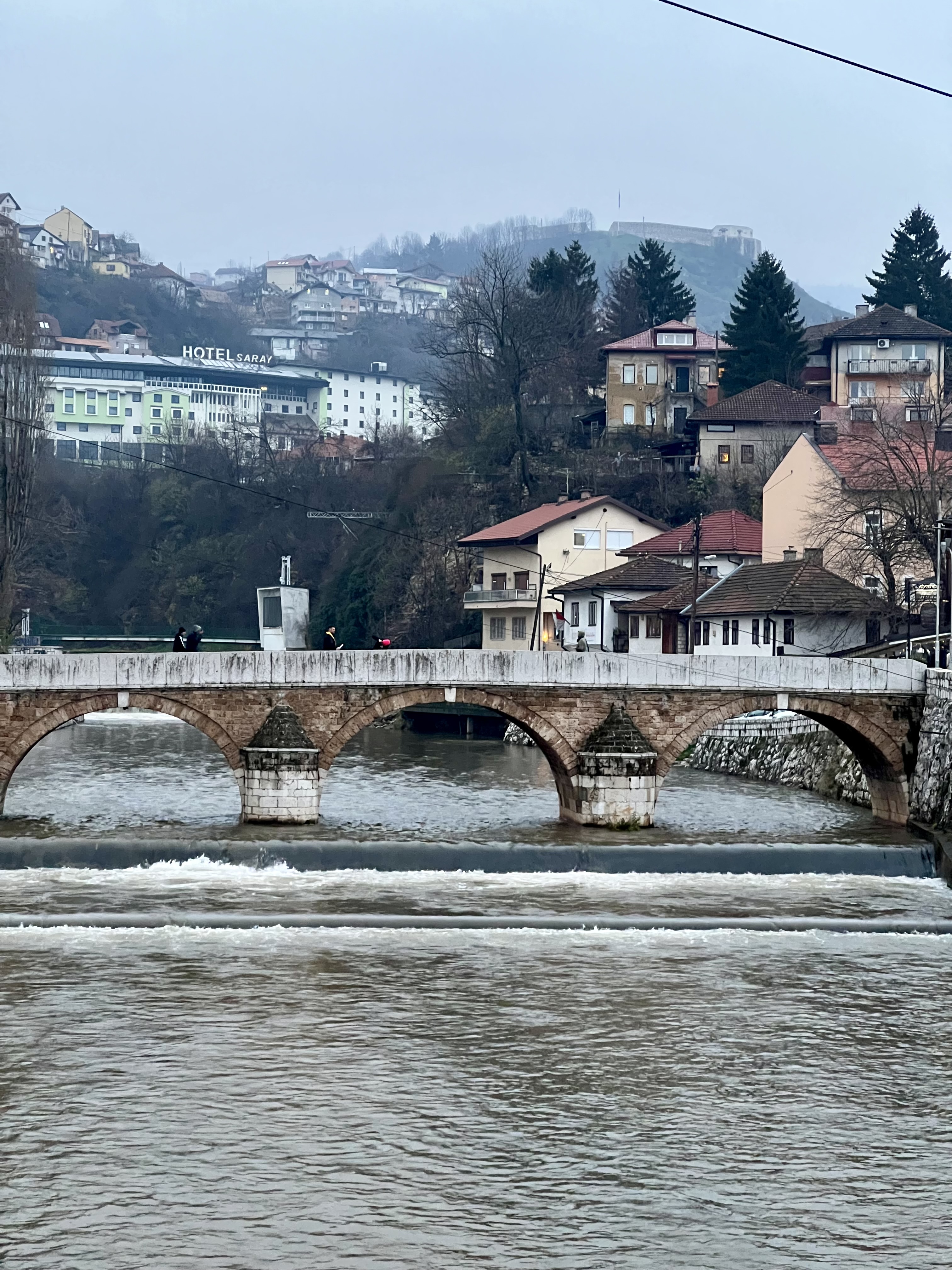 Погода во время моей поездки была без дождей, но зимой в Сараево почти всегда стоит туман и смог. Во-первых, город находится в низине и окружён горами, из-за чего туман является здесь обычным явлением и создаёт немного депрессивную атмосферу. Во-вторых, многие местные жители отапливают дома дровами и пеллетами, поэтому в городе часто стоит смог и ощущается запах гари.