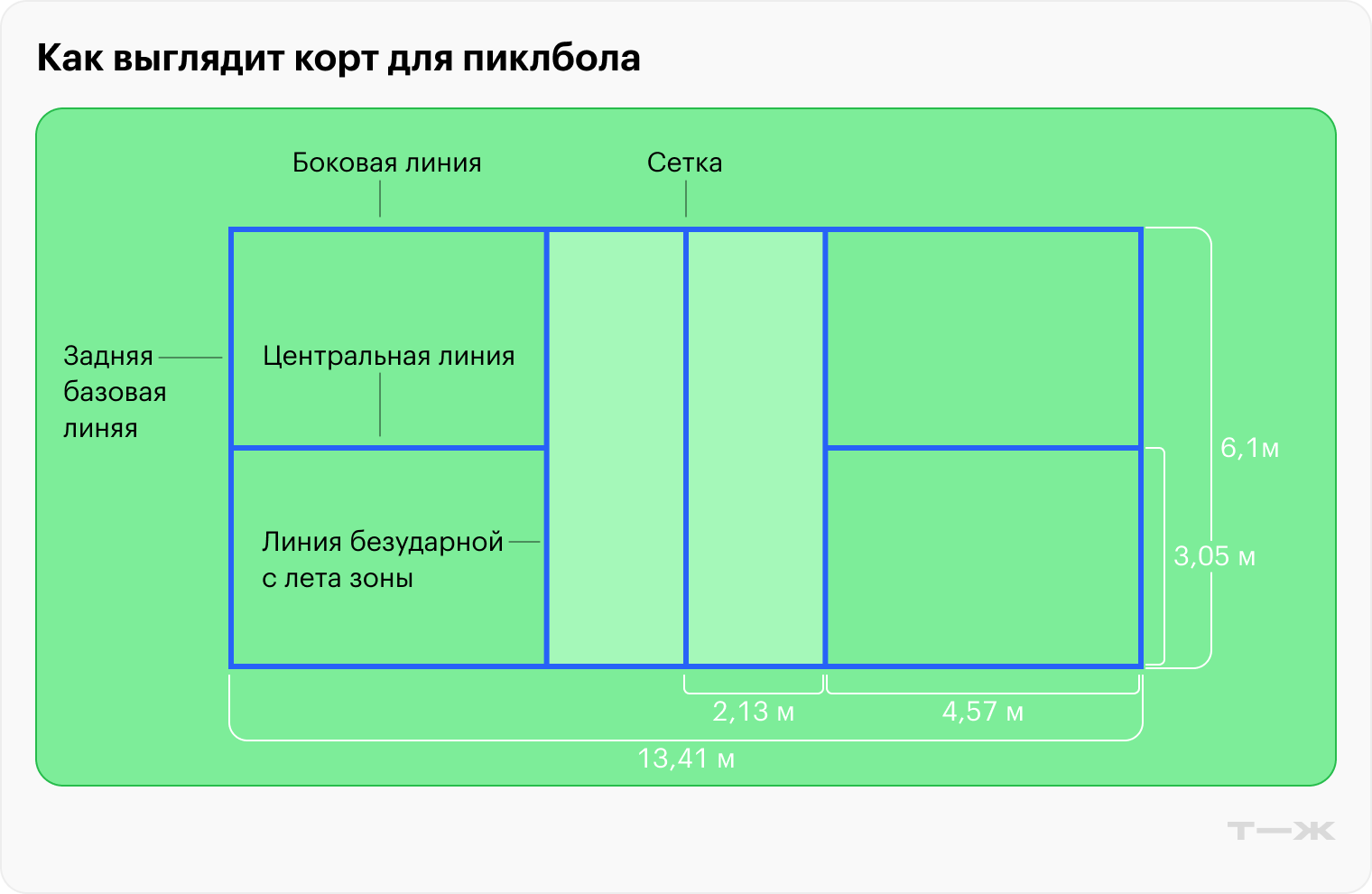 Размеры площадки и разметка. У корта для пиклбола одинаковые размеры для одиночной и парной игры — 6,1 м в ширину и 13,41 м в длину. По краям расположены зоны безопасности, или забеги, — 1,5 м по бокам и 3 м за задними линиями.
