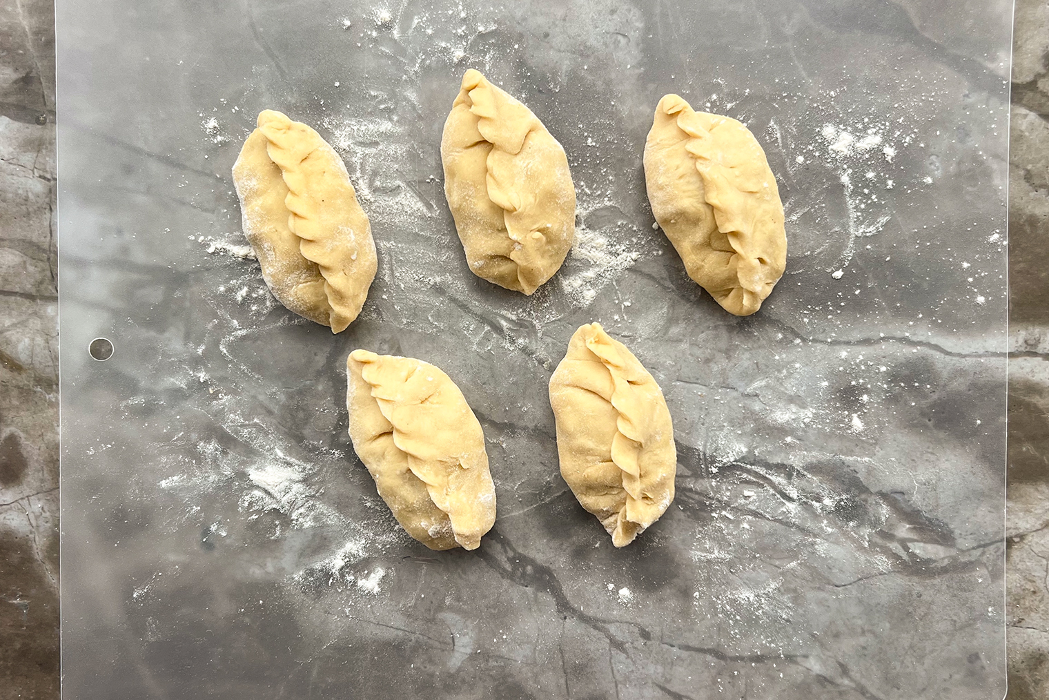Шаг 8. Края теста плотно защипните, формируя посередине пирожка гребень