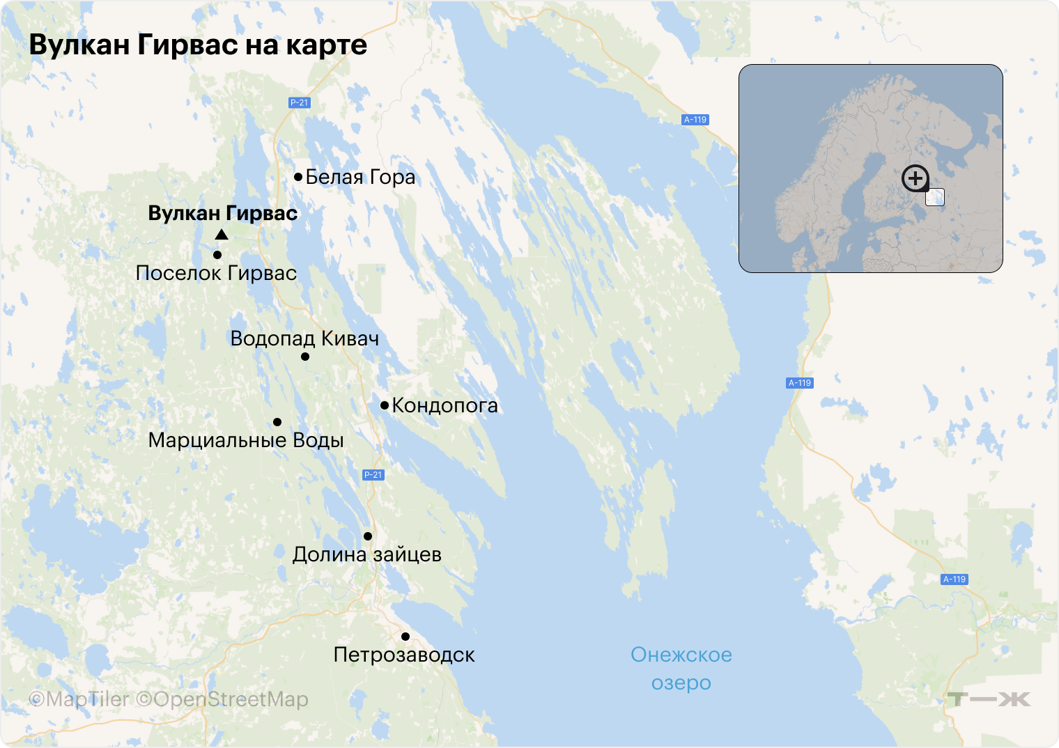На машине. Большая часть пути из Петрозаводска и Кондопоги проходит по федеральной трассе Р21 «Кола». Вулкан обозначен на картах в навигаторах, указатель на поворот на трассе тоже стоит — мимо не проехать. Дорога из Петрозаводска займет 1 час 20 минут, из Кондопоги — около 40 минут.