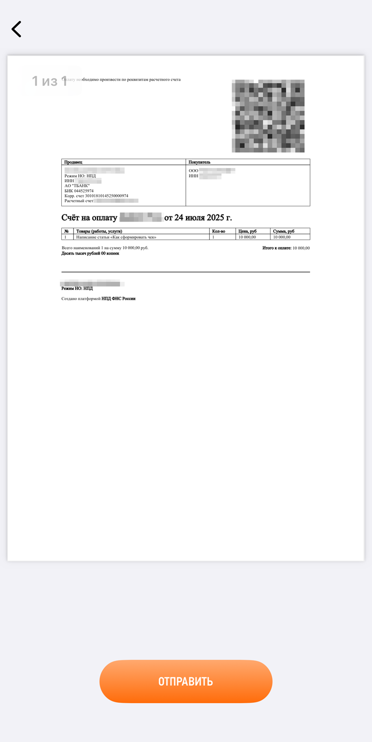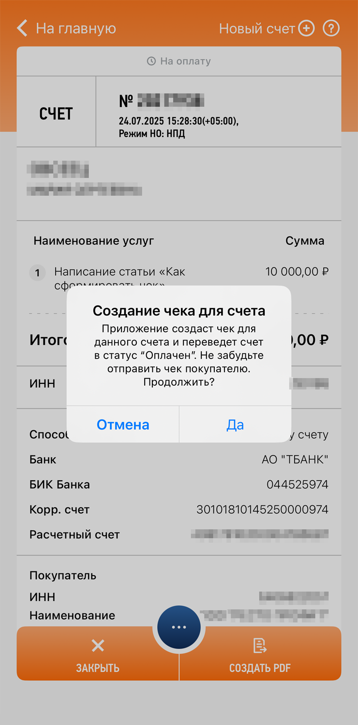 Самозанятый всегда должен оформлять чеки и отправлять их клиентам. После оплаты счета это тоже нужно делать.
