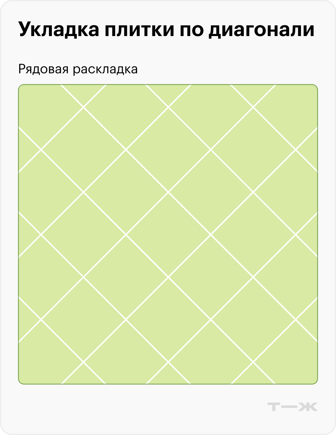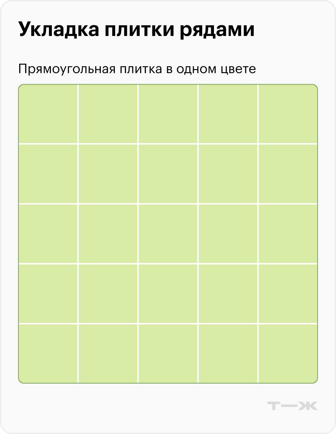 Рядовая укладка. Самый простой и экономный вариант. Плитки кладут ровными рядами без смещения — швы образуют прямые линии. Минимум подгонок, резки и отходов. Идеально для начинающих.