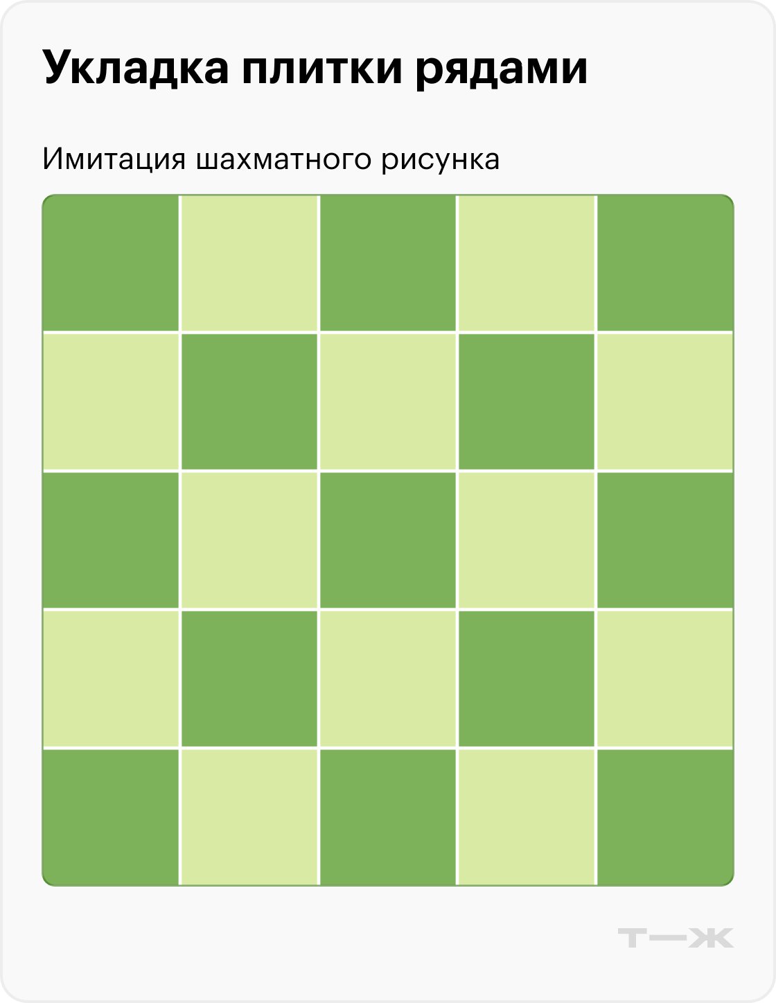 Простоту рядовой раскладки можно компенсировать интересной фактурой самой плитки — например, выбрать дизайн под камень или под древесину. Еще часто берут плитку двух цветов и раскладывают в шахматном порядке. За счет комбинации контрастных плиток достигается интересный геометрический эффект. В этом случае плитку обычно берут квадратной формы, реже прямоугольной, но одного размера. Иногда рисунок укладывают диагонально — под 45 градусов относительно стены.