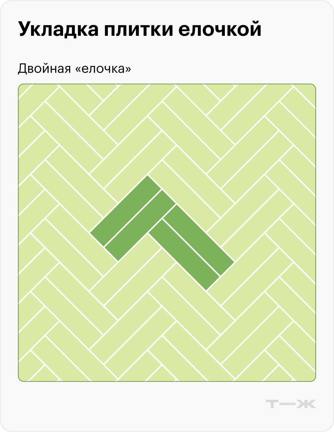 Елочка. Классический способ для плитки, имитирующей паркетную доску. Элементы укладывают под углом 90 градусов друг к другу, создавая рисунок-елку. Для такой раскладки используют плитку с фаской: без нее выглядит хуже. Иногда делают и двойную «елочку» — по две плитки перпендикулярно друг к другу, как на картинке ниже.