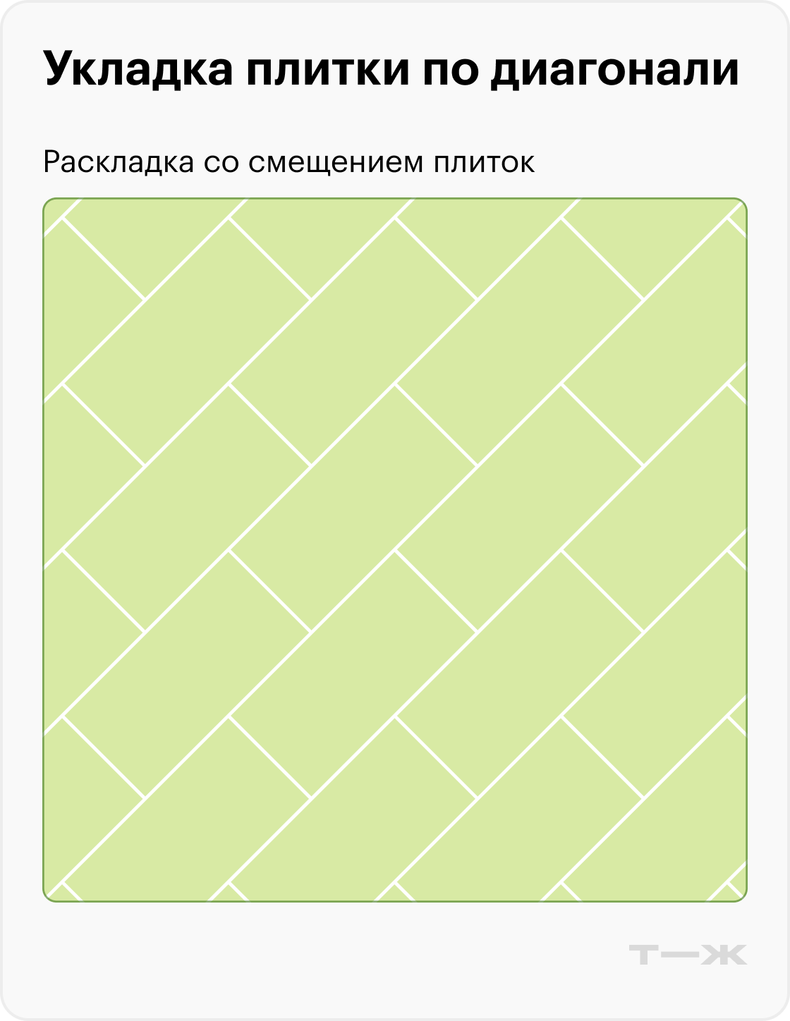 По диагонали. Плитку укладывают под 45 градусов к стенам со смещением или без. Это смотрится эффектнее, визуально расширяет пространство, что актуально для малогабаритных квартир и мини-домиков. Но такая облицовка гораздо сложнее в исполнении и даст еще больше отходов — до 15%.